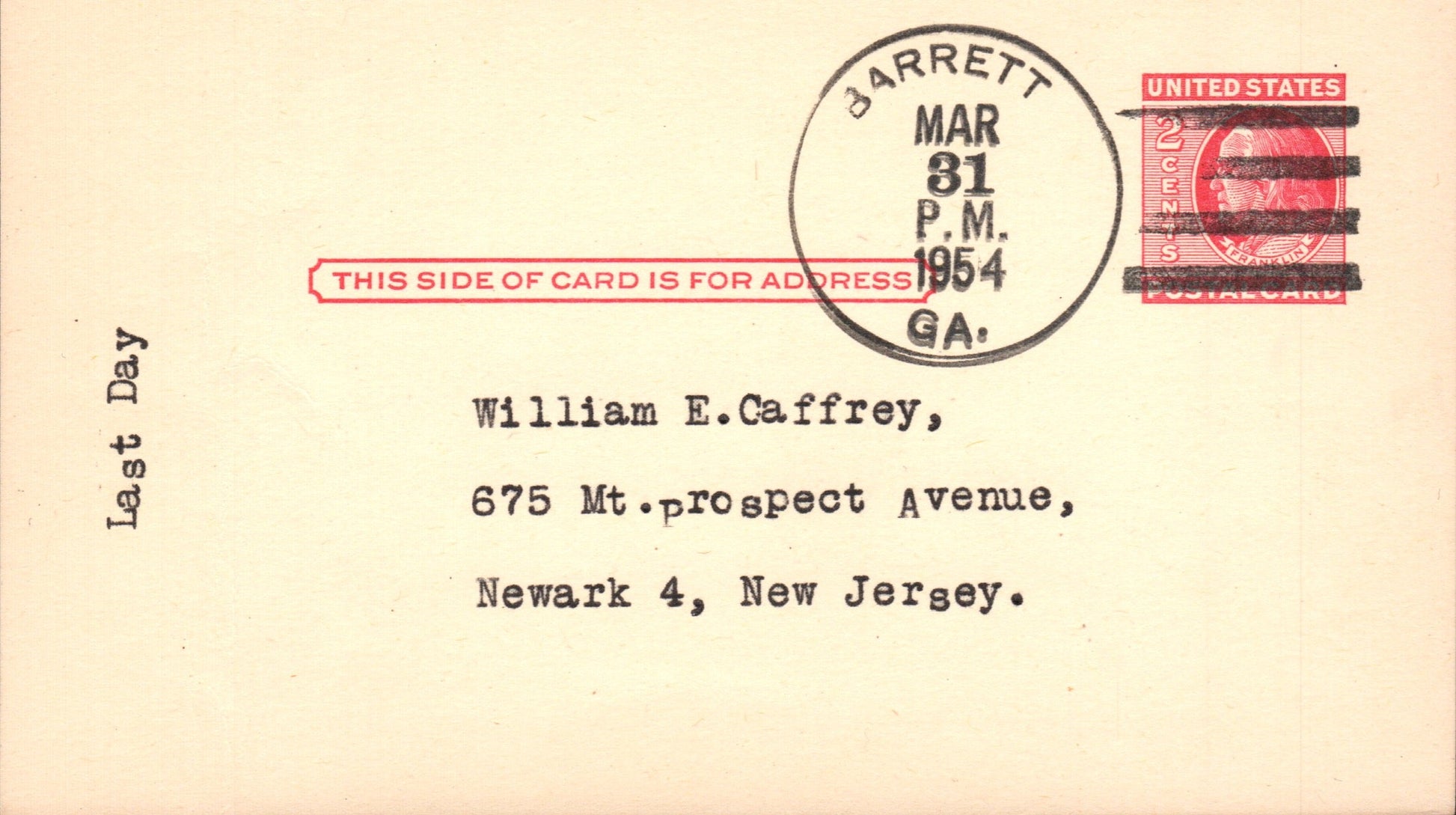 Barretts (1909/1954) 1954 4-bar on LD Postal Card, PM autograph on back