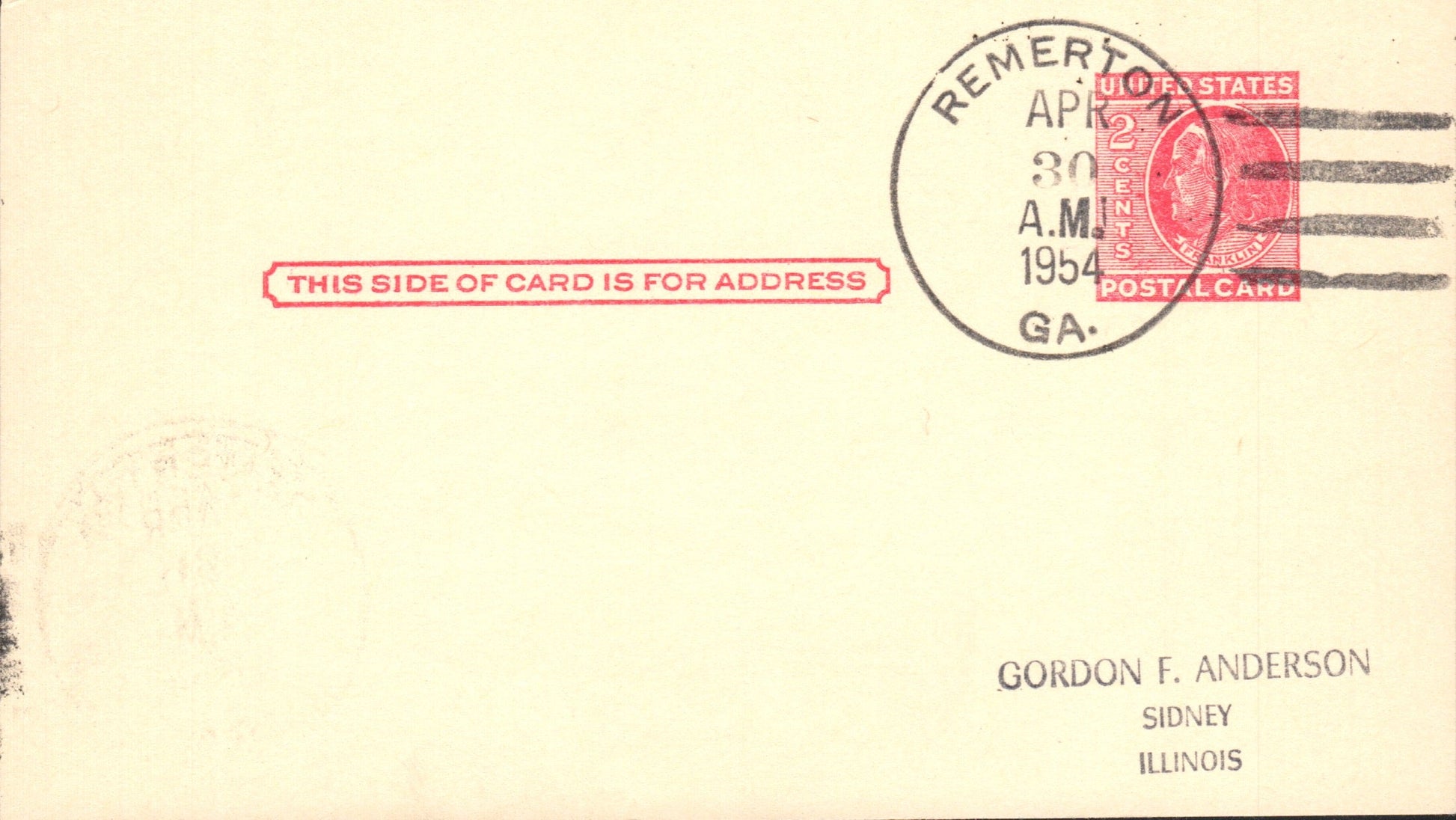 Remerton (1901-1954) 1954 4-bar on LD Postal Card