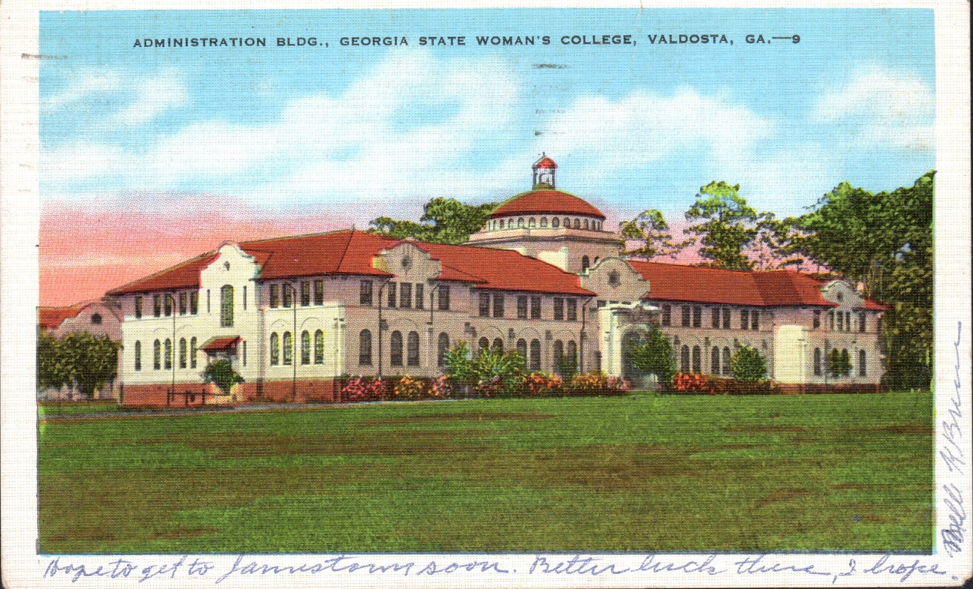 Post cards: Holiday Terrace Motel [chrome]; Imperial 400 Motel [chrome]; Jolly Inn, “$9.88 up” [chrome]; Pines Camp Hotel Cottages [linen]; Shamrock Motel [chrome]; Southern Motel [linen]; Valow Motel [chrome]; Court House [linen]; Emory Junior College [2 views, 1930s]; Georgia State Women’s College [2 views, 1930s]; “Old Colonial West Home” [1930s]