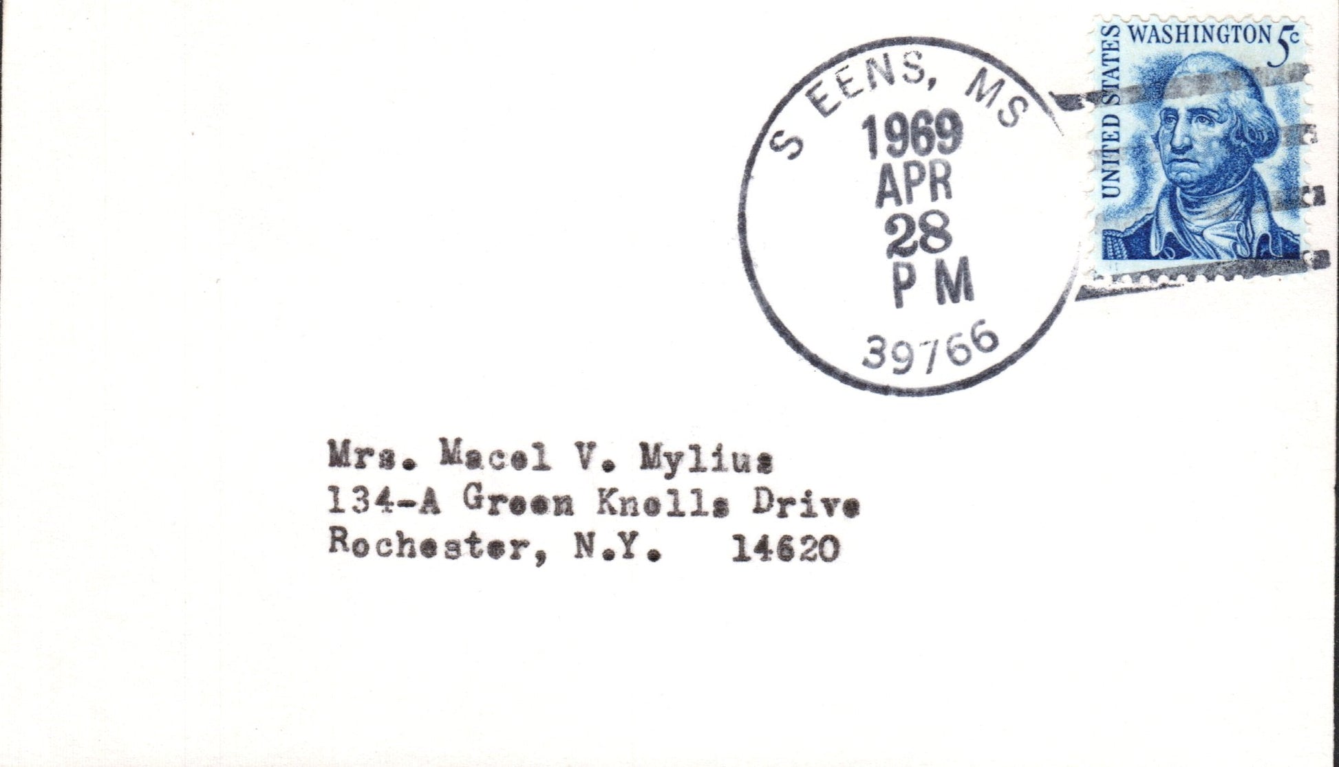 Steens 1969 4-bar on 3x5 card, fine postmark but ”T” is missing