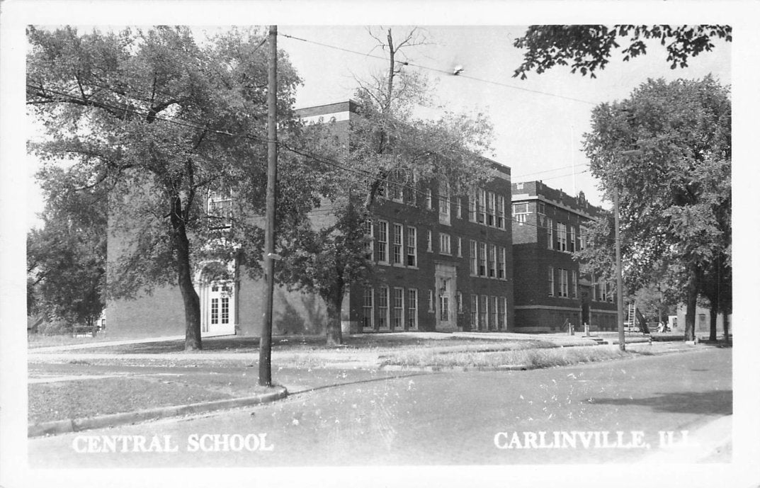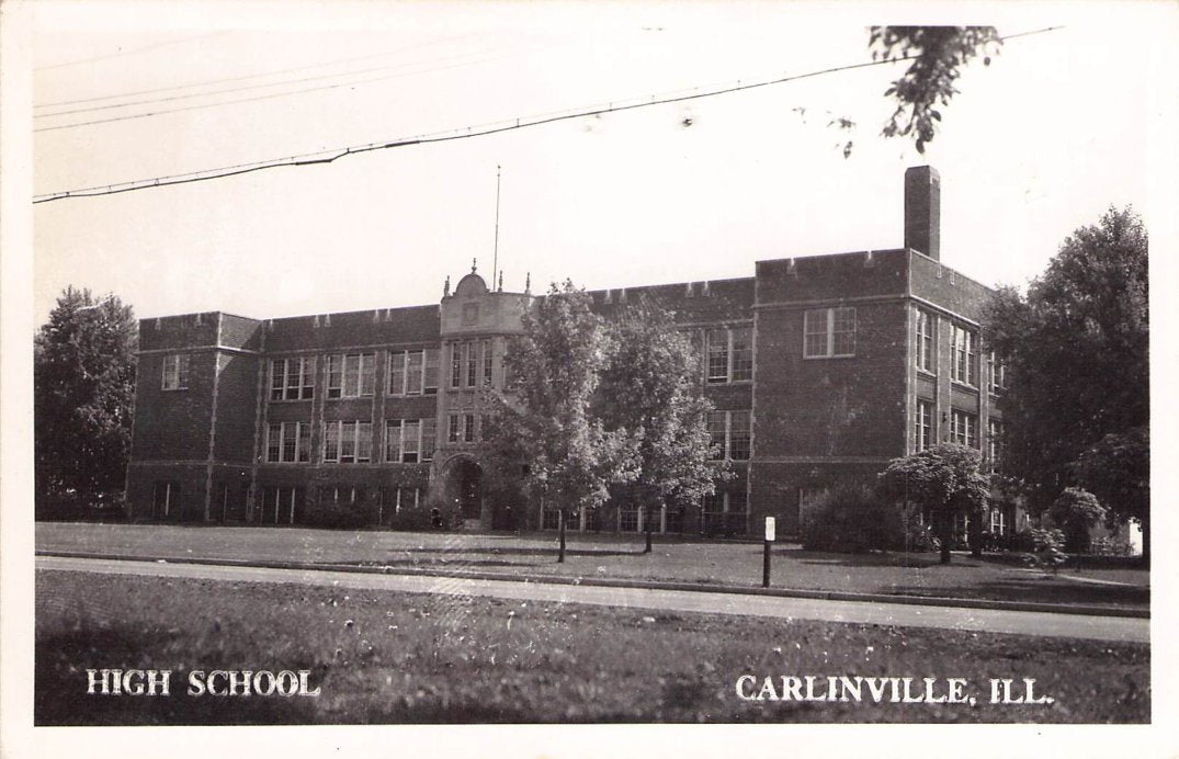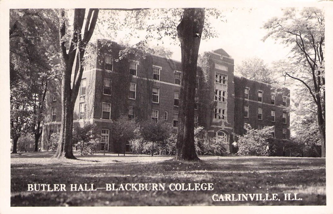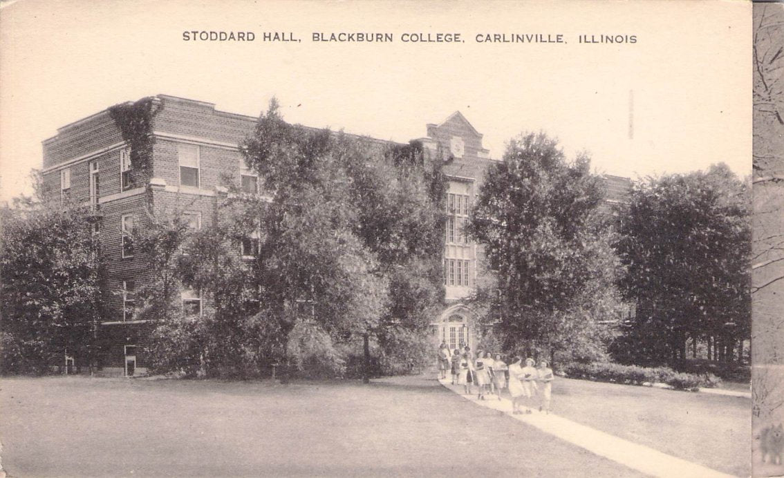 Post cards: Macoupin Hospital [real photo, 1940s]; “East Main Street” [1914 RPO cancel, creases]; Central School [real photo]; High School [real photo]; Blackburn College [3 real photo views, Butler Hall, Stoddard Hall, Liberal Arts Bldg.]; Stoddard Hall [B&W, students]; McKinley House [B&W]; St. Joseph Catholic Church [real photo]