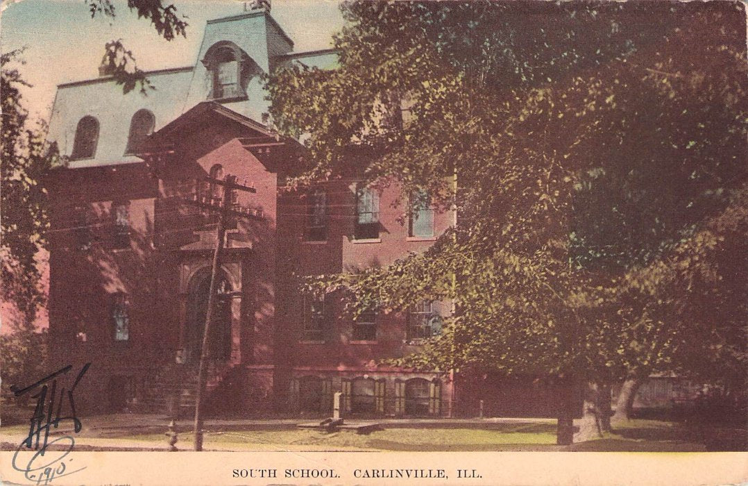 Carlinville 1910 date-out duplex on post card; 1965 4-bar on 3x5 card