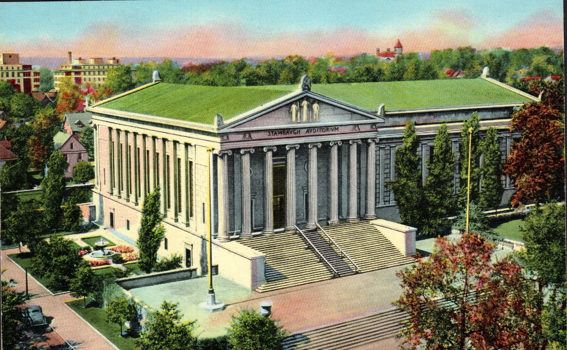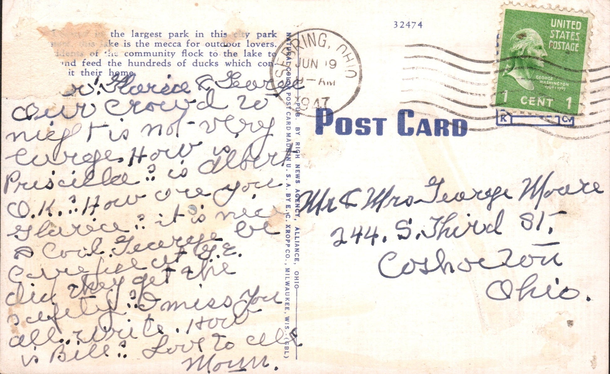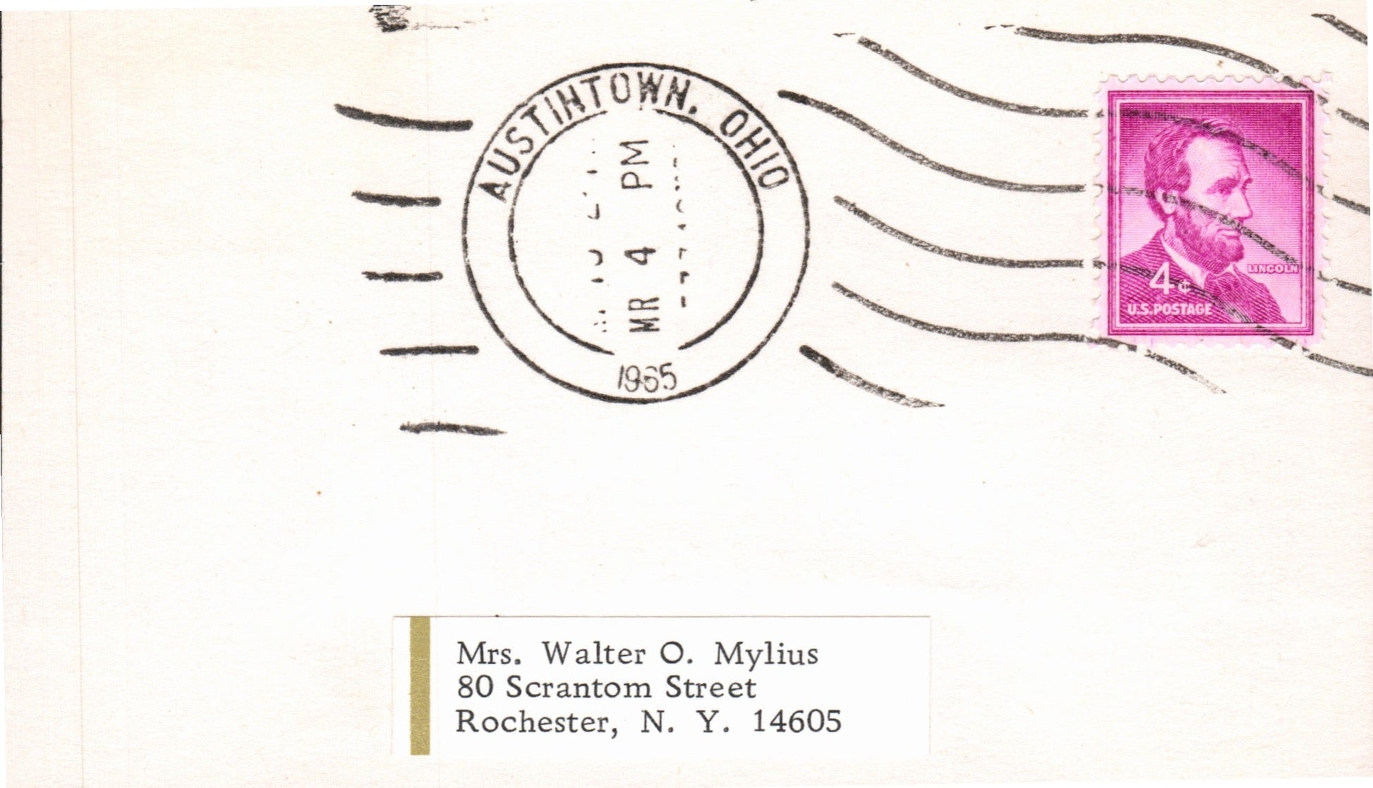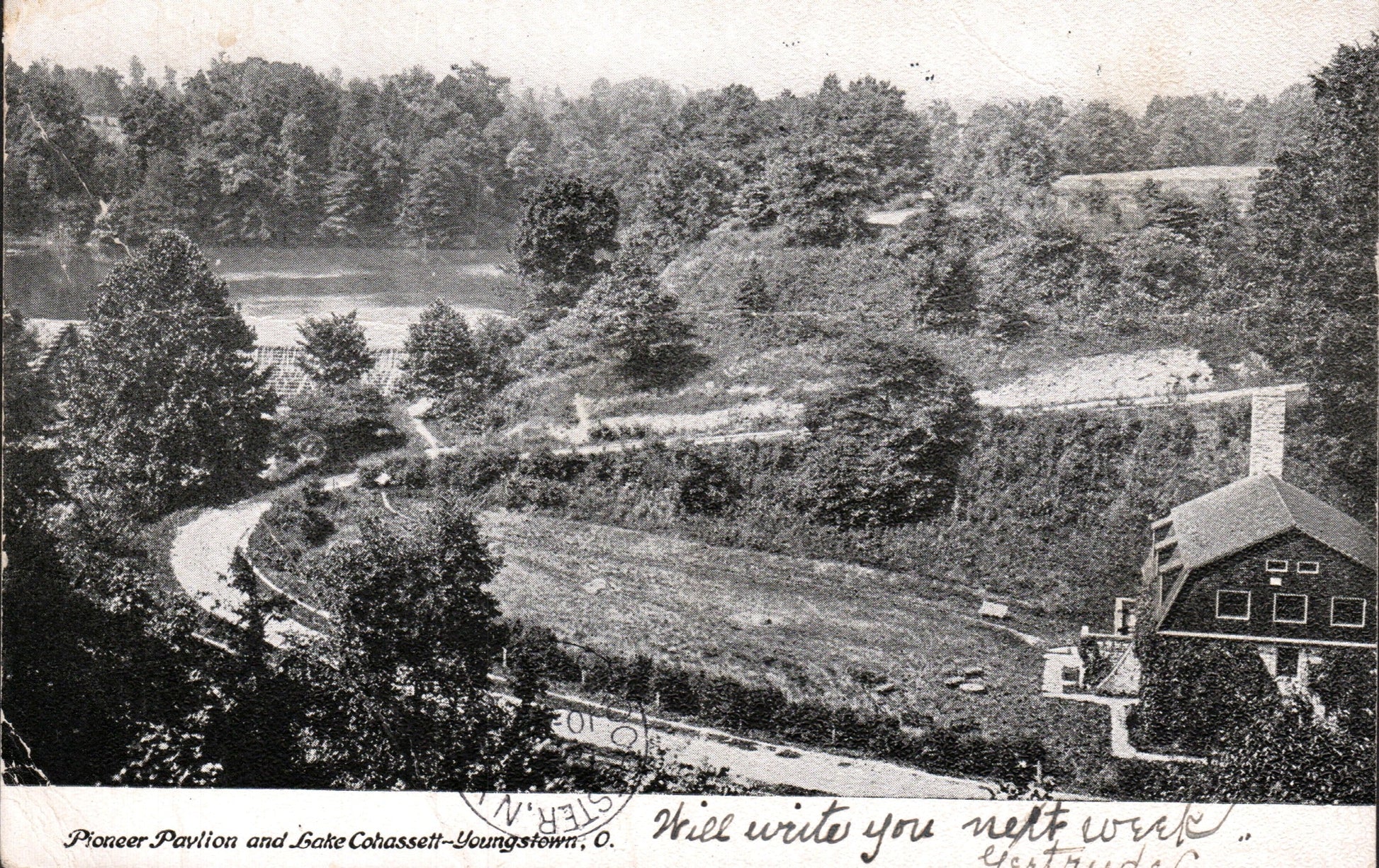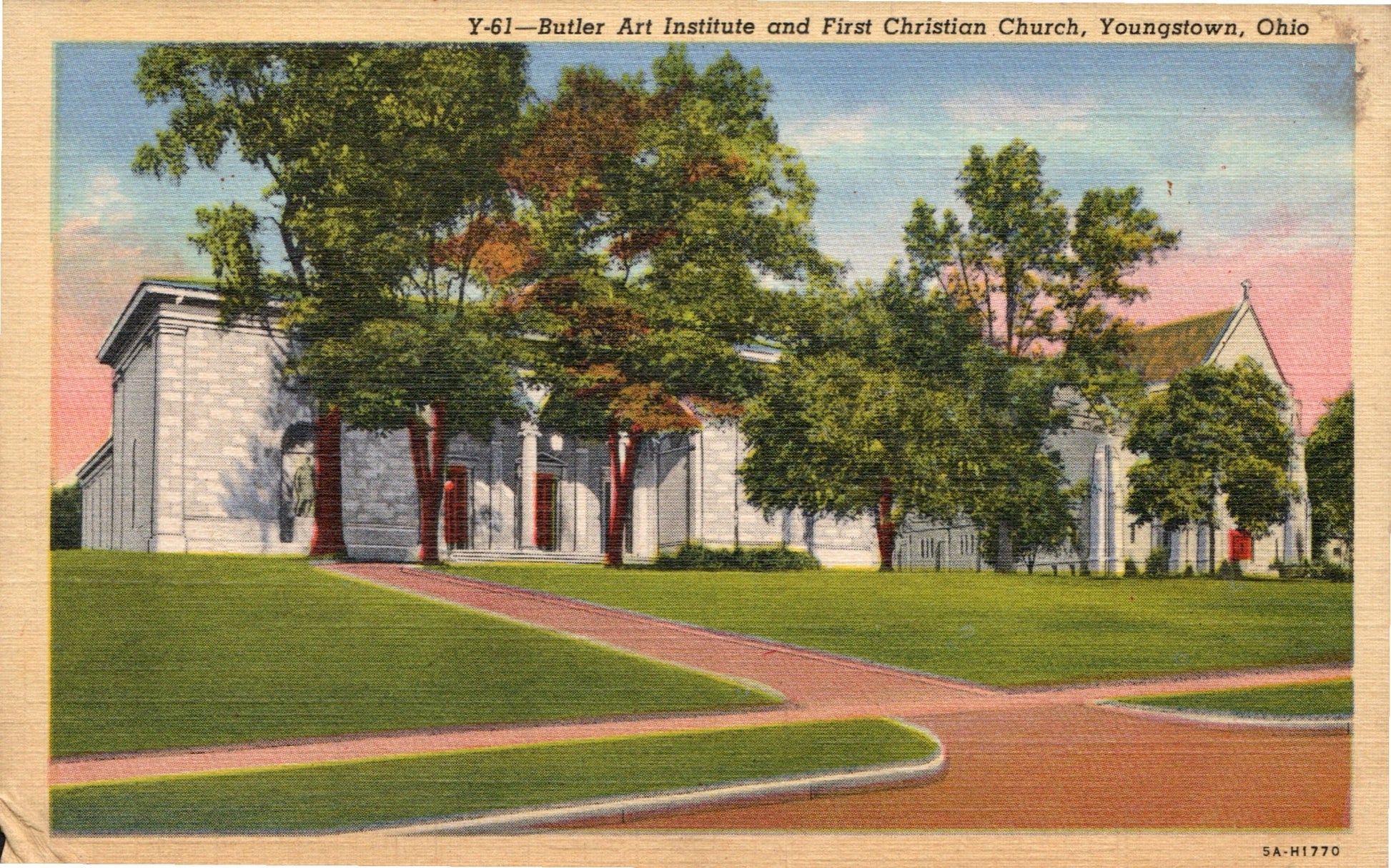 Post cards: “The Heart of Youngstown from the Air” [linen, 1947]; Harvest House Cafeteria (interior view) [chrome] Stambaugh Auditorium [c.1950?]; Butler Art Institute [c.1940]; U. of Youngstown Library [linen]; Pioneer Pavilion and Lake Cohasset (B&W, 1905], postal markings on front doesn’t affect view much