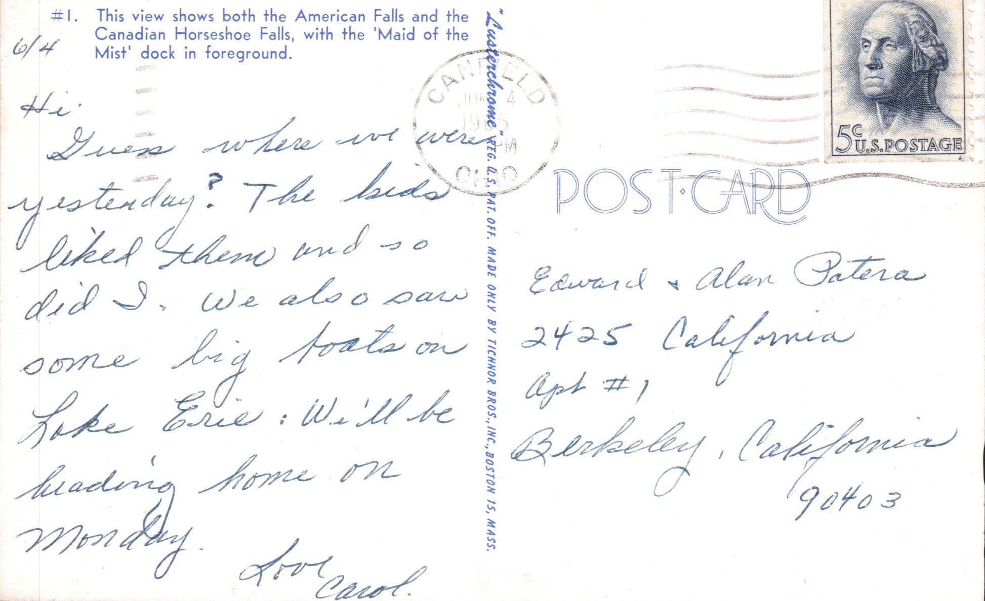 Canfield 1916 duplex on post card; 1965 machine cancel on post card