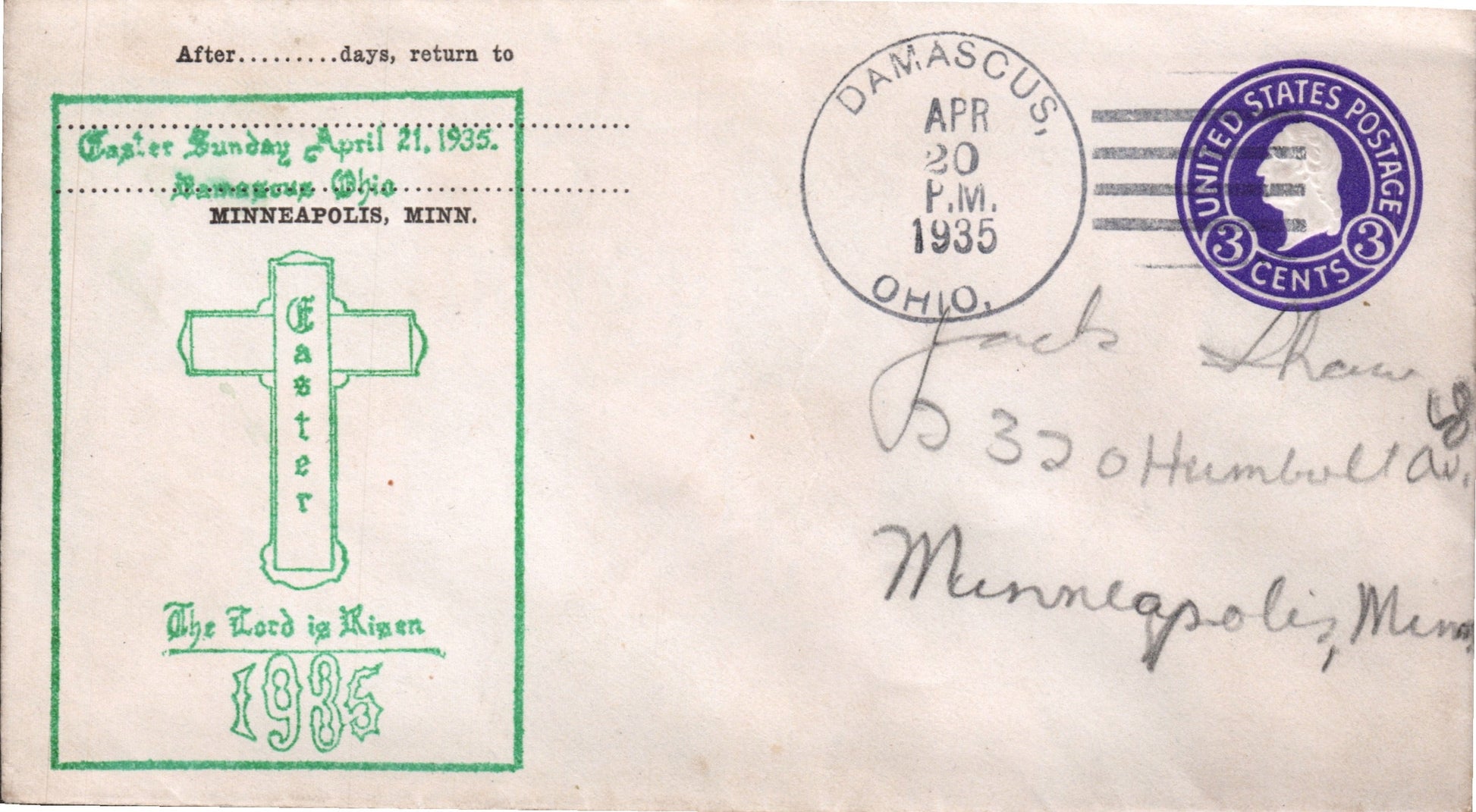 Damascus 1935 4-bar on cover, Easter cachet; 1970 4-bar on cover