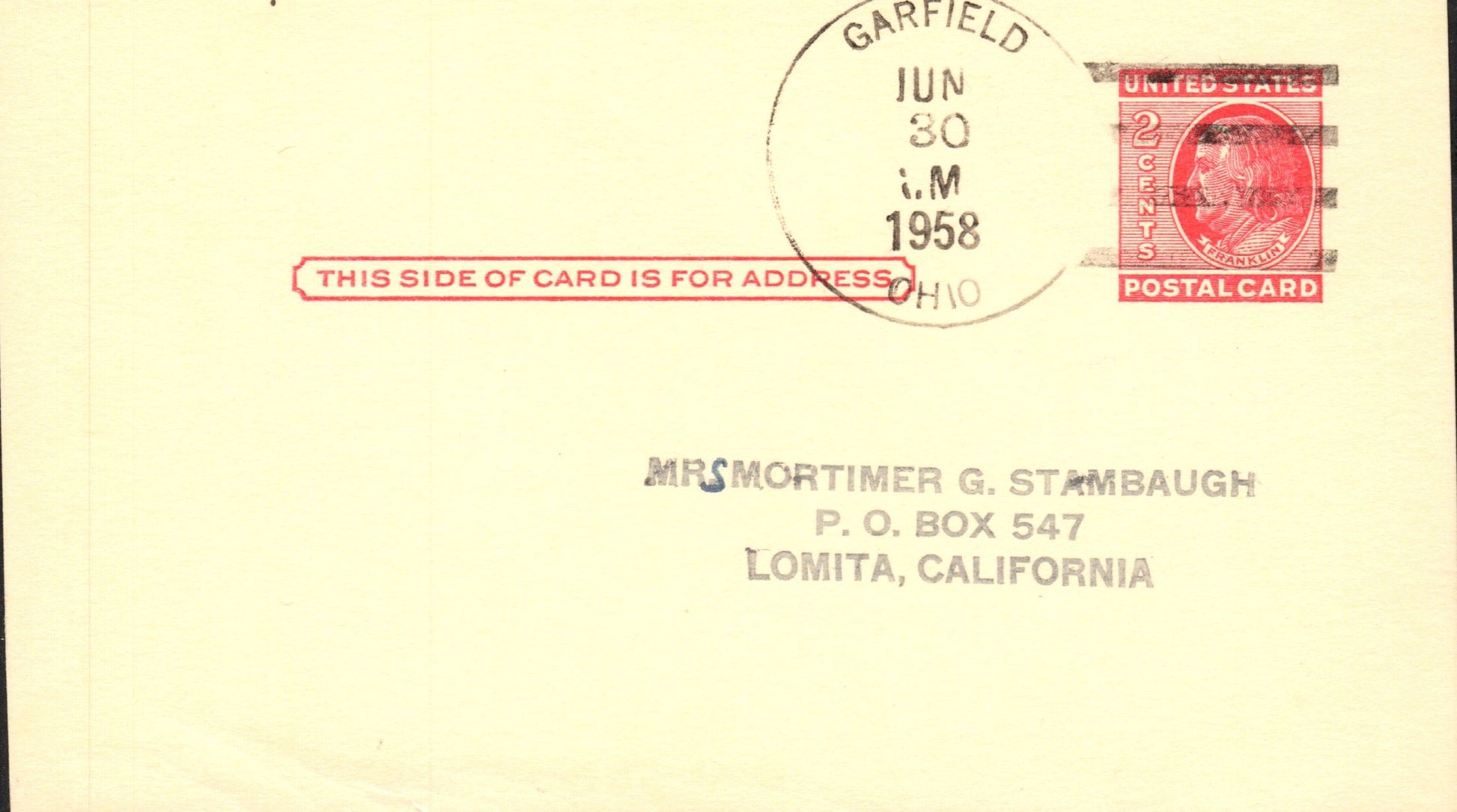 Garfield (1869-1958) 1958 4-bar on LD Postal Card