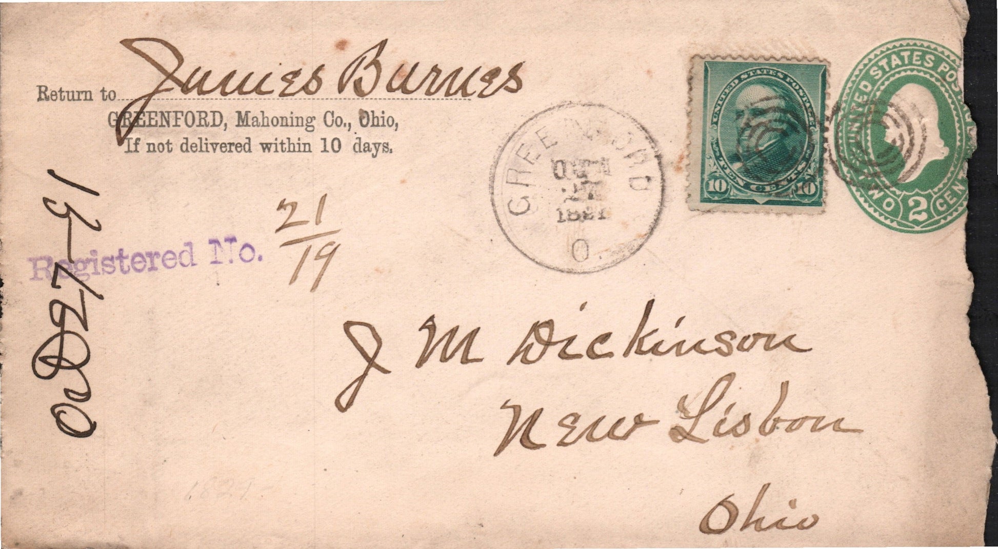 Greenford 1891 cds with target killer Registered cover to New Lisbon, 10¢ stamp added to 2¢ Postal stationery, no backstamps. Original contents state $2.50 was enclosed; 1917 Doane on post card