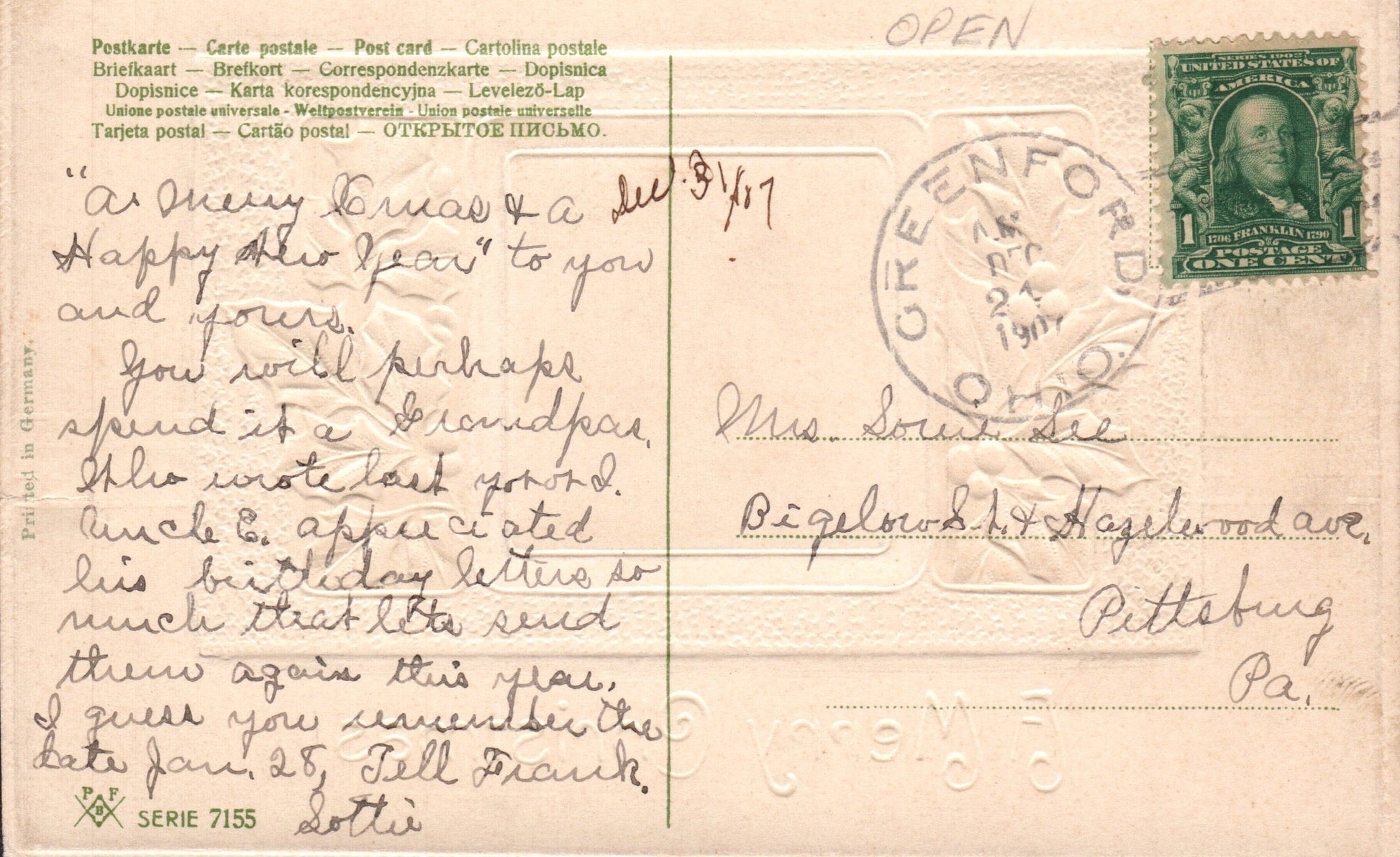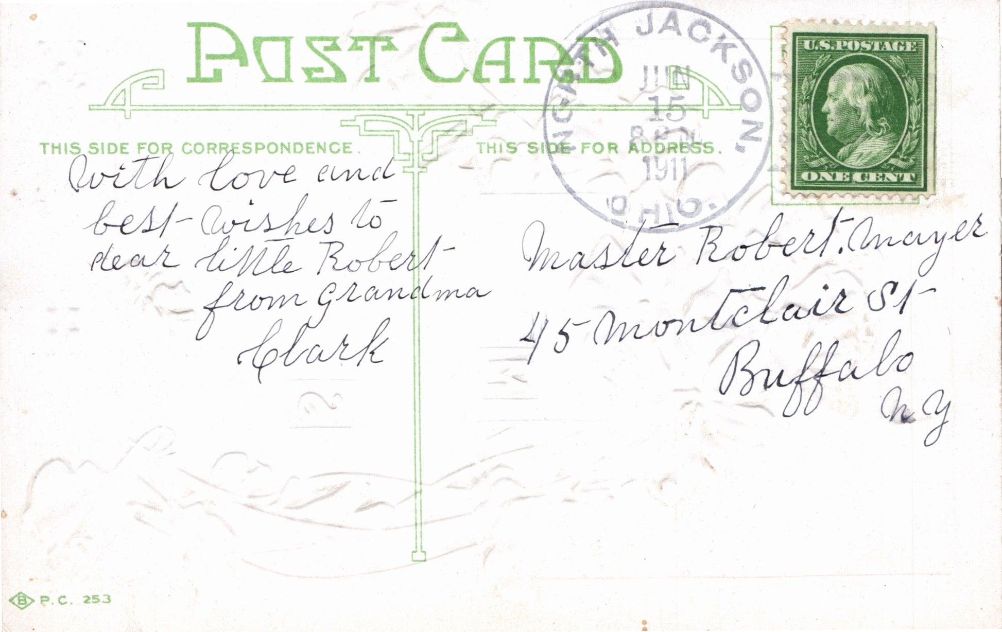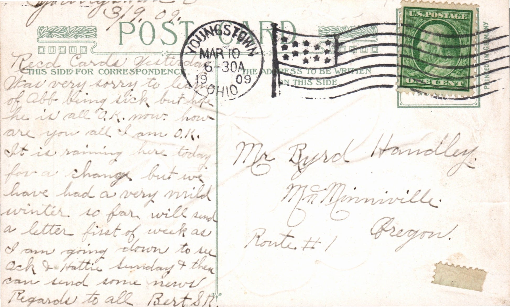 Youngstown 1909 Flag cancel on St. Patrick’s Day post card; 1916 machine cancel on post card.