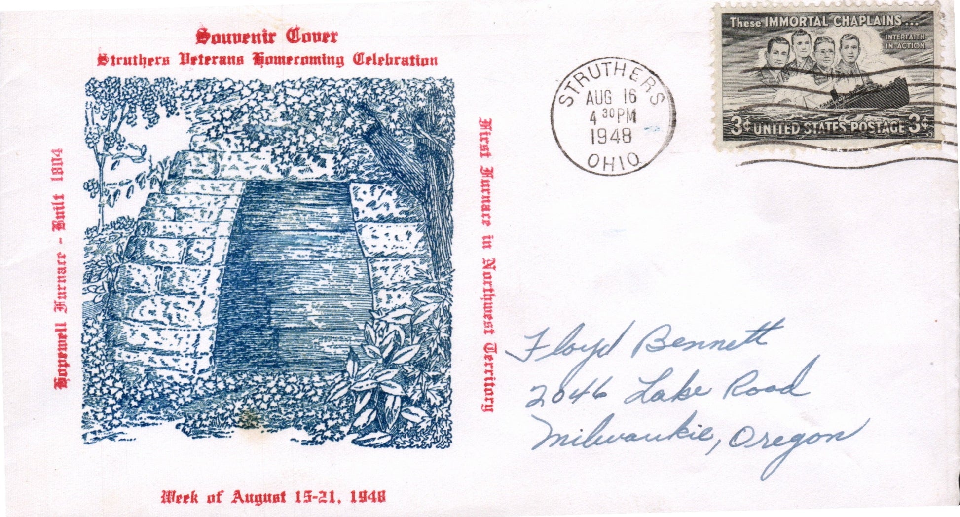 Struthers 1948 machine cancel on cacheted cover for Veterans Homecoming Celebration