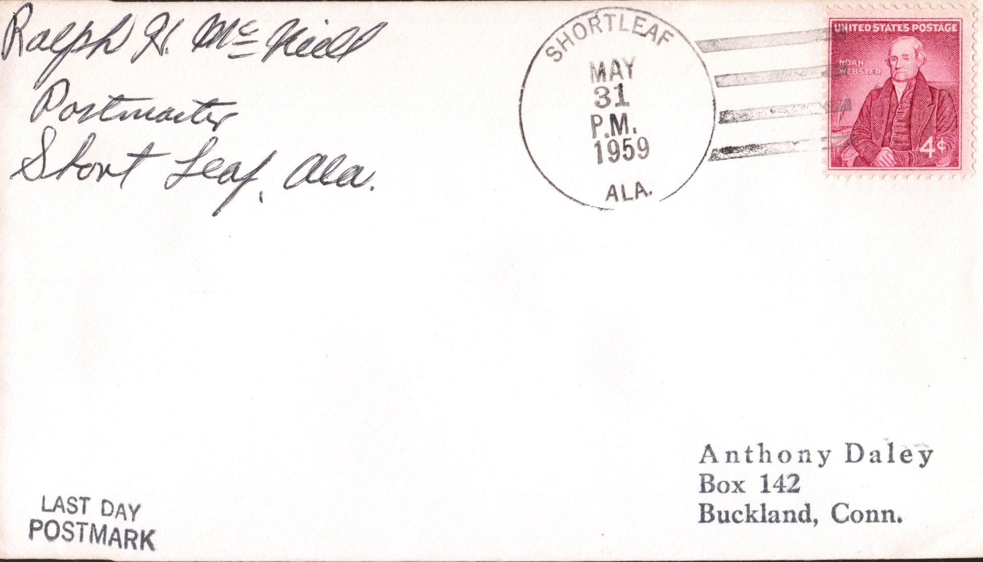 Shortleaf (1910-1959) 1959 4-bar on cover, PM autograph