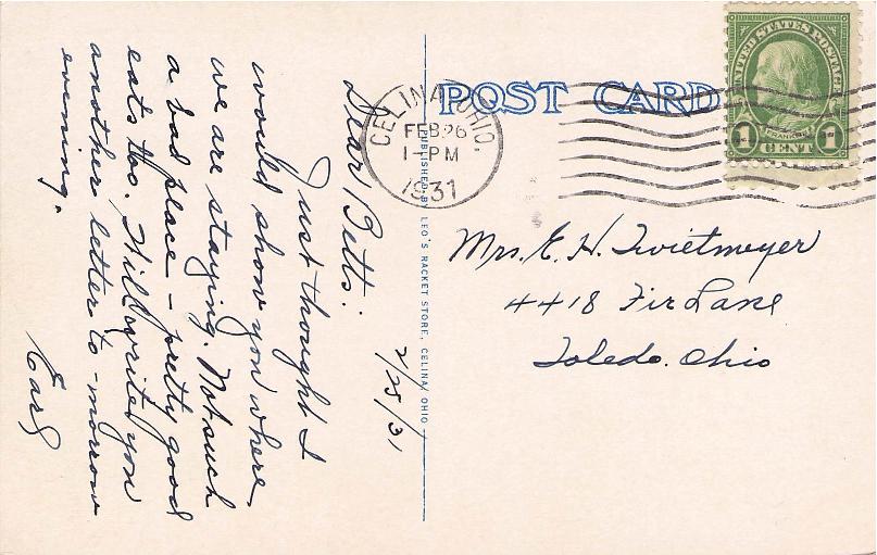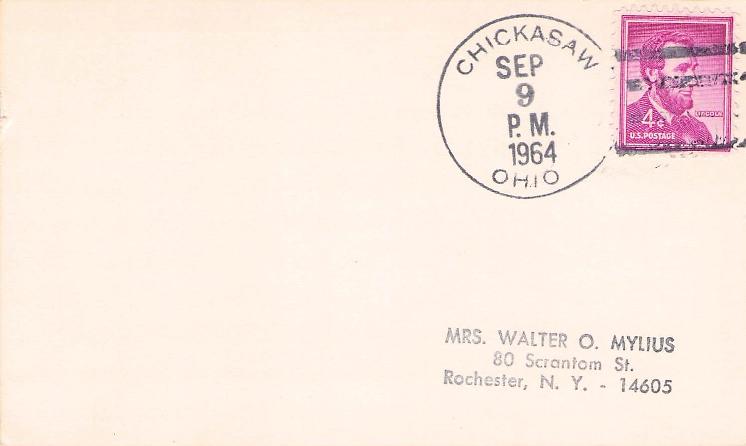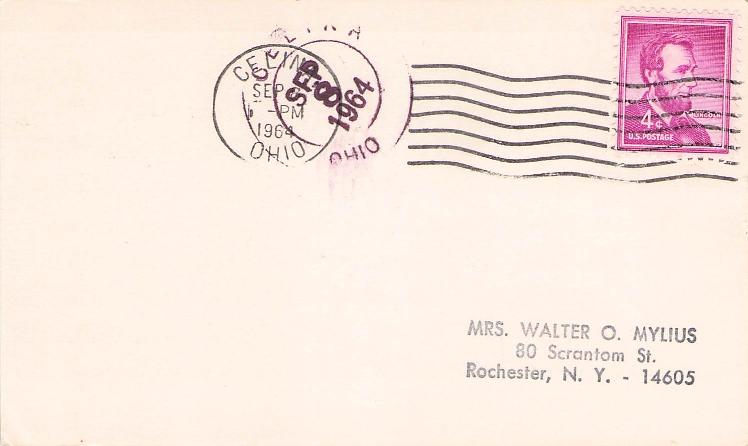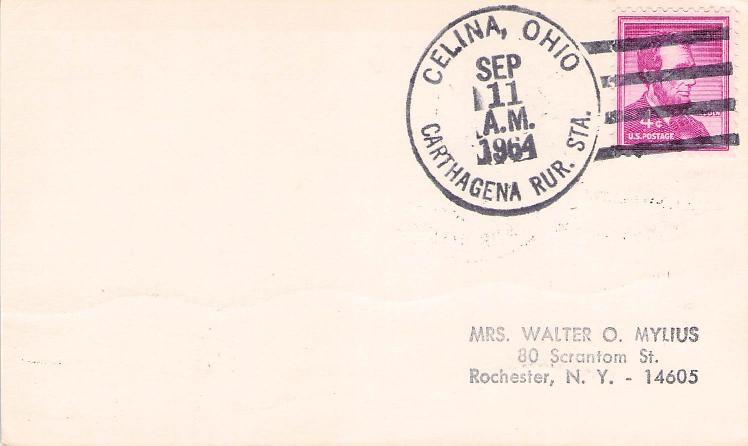 Celina 1931 machine cancel on post card, view of Mercelina Park Hotel; 1948 machine cancel on post card [linen] view of “Scotty’s Beach, North Shore, Celina”; 1964 machine cancel overstriking round dater on 3x5 card.