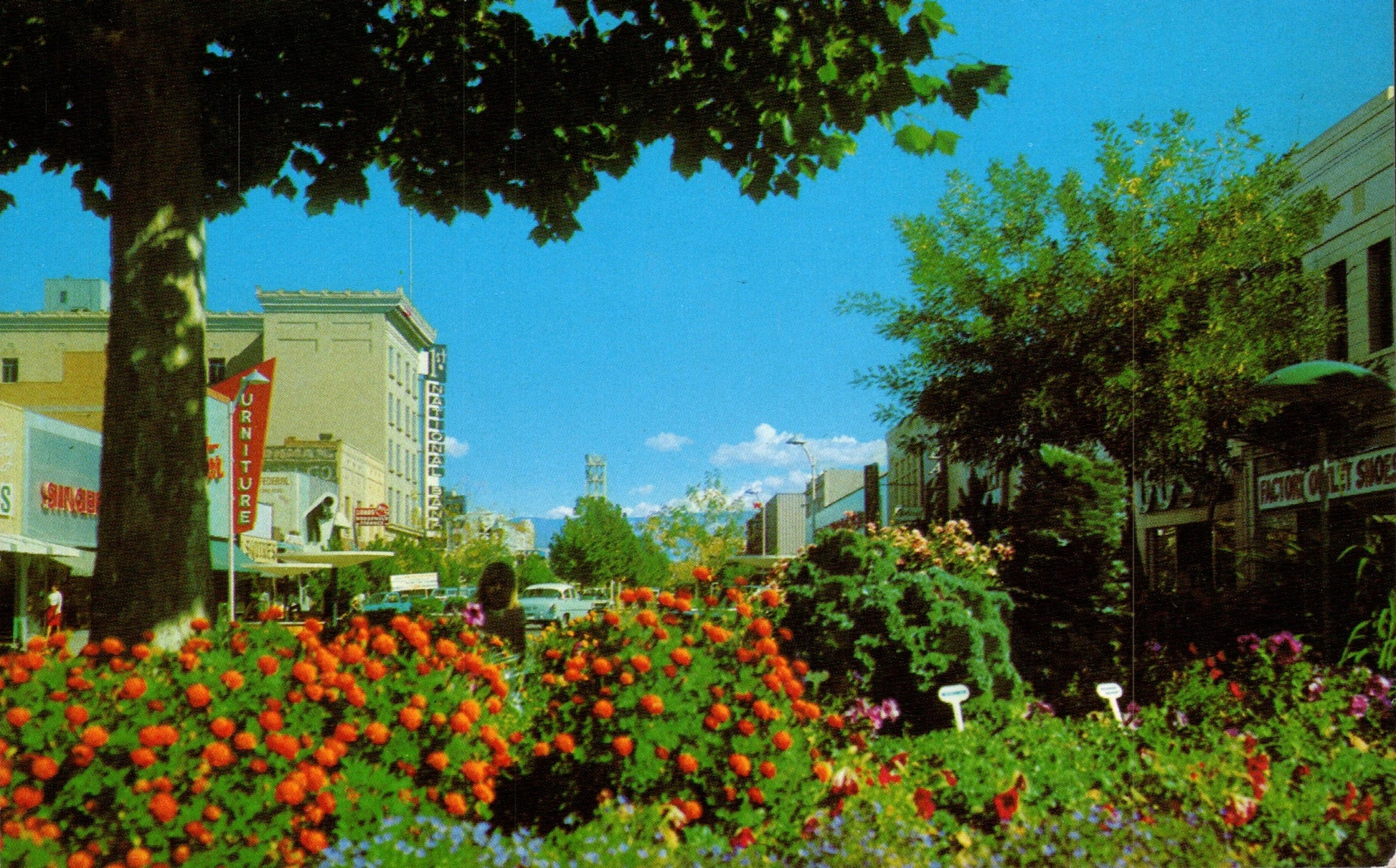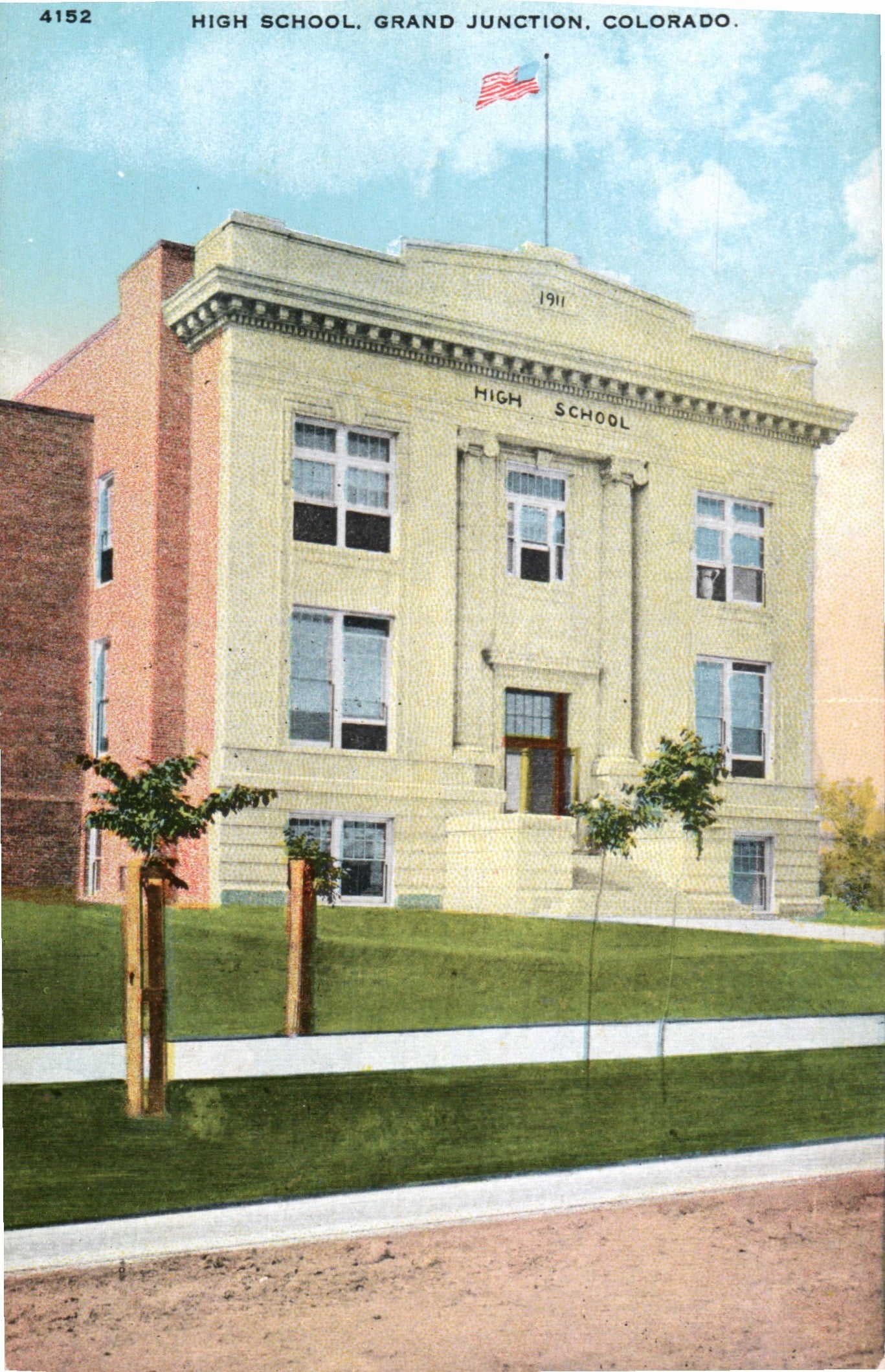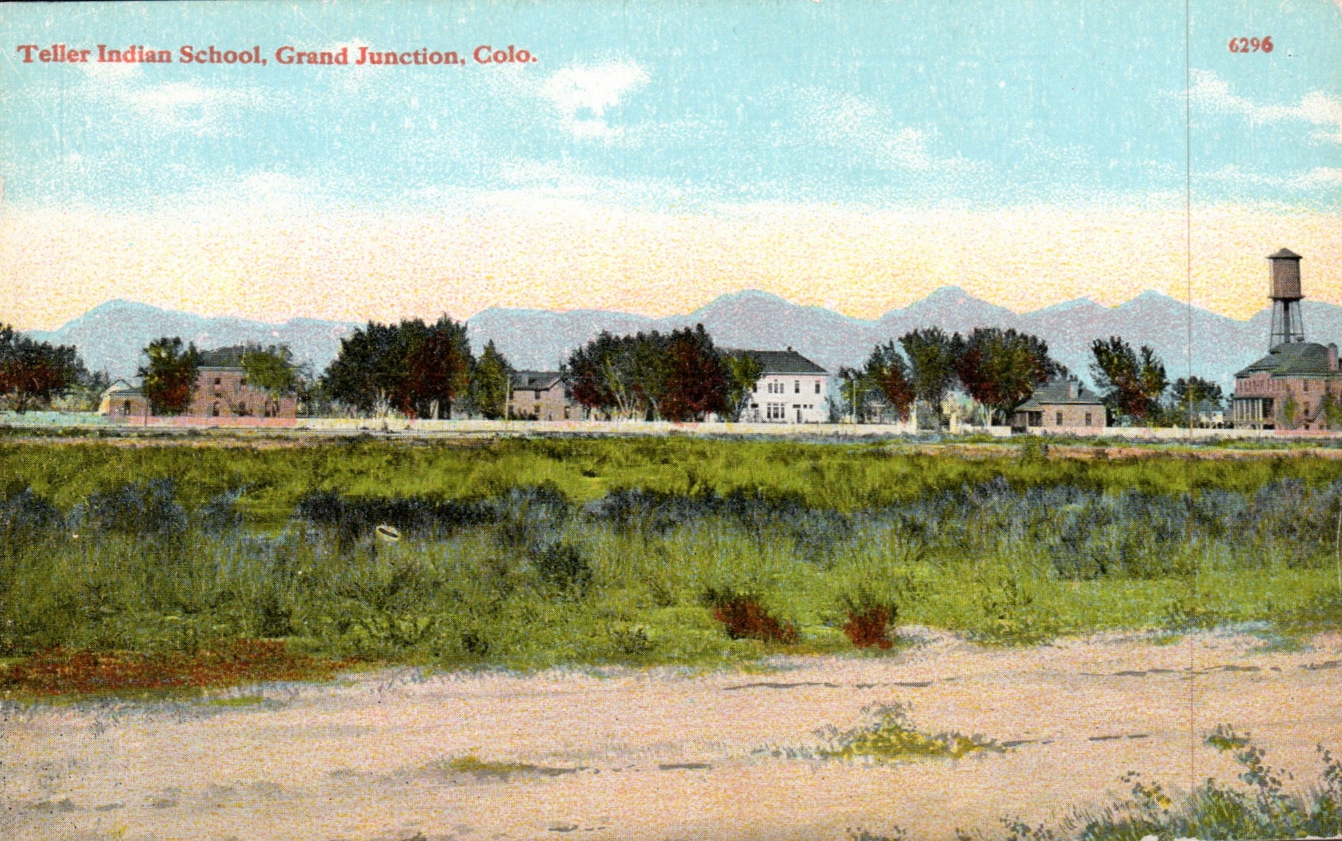 Post cards: Downtown Shopping Park [chrome]; Grand Valley National Bank [c.1910]; Teller Indian School [c.1910]; High School [c.1910?]