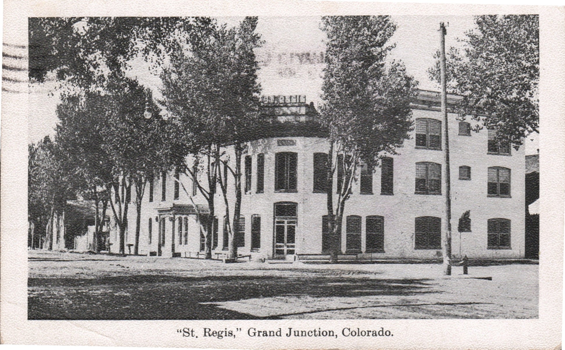 Grand Junction 1910 Flag cancel on post card, B&W view of St. Regis Hotel; 1920 machine cancel on post card, B&W view of City Park