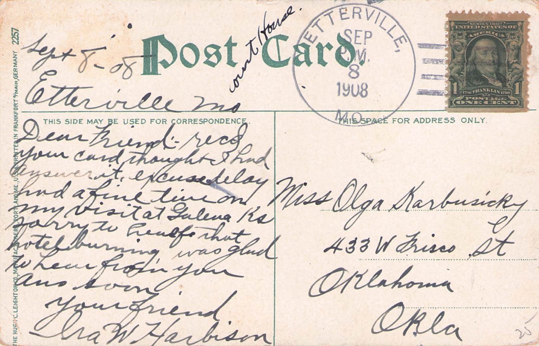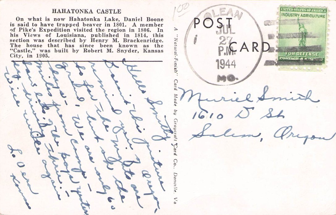 Olean 1944 4-bar on post card, view of Hahatonka Castle