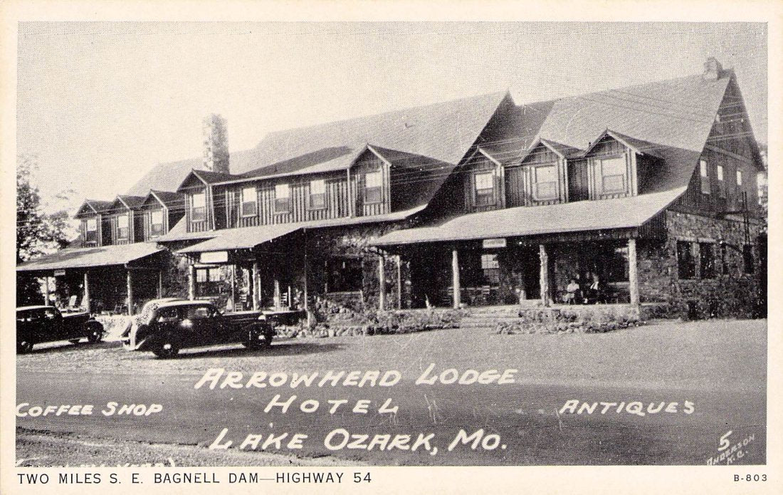 Lake Ozark Post card: Arrowhead Lodge Motel [B&W, c.1940]; Jolly Roger Motel [chrome]; Our Lady of the Lake chapel [chrome]