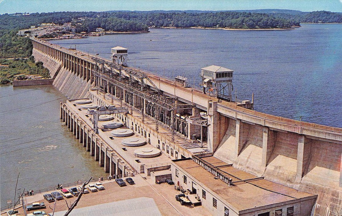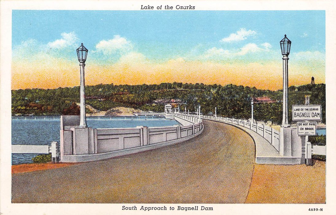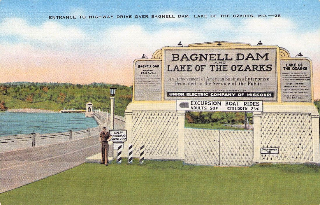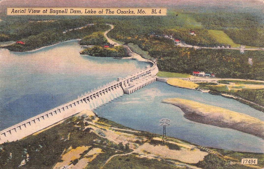 Bagnell Dam Post cards: Aerial view [linen]; Sign and dam [linen]; overview in silver [printed in Germany]’ Bird’s-eye view [chrome]; Dam and lake [linen]