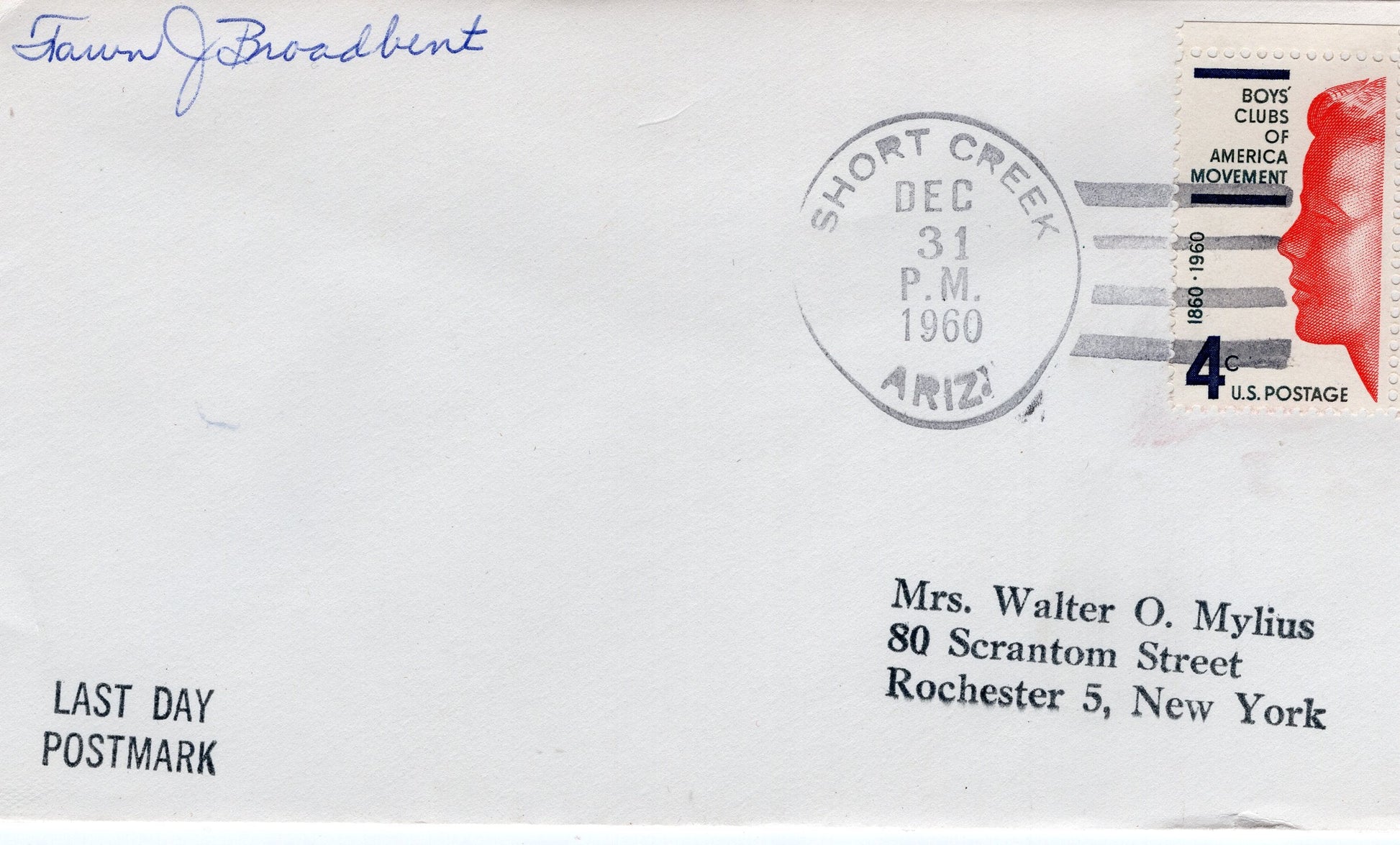 - Short Creek (1914-1960) 1960 4-bar on LD cover, PM autograph