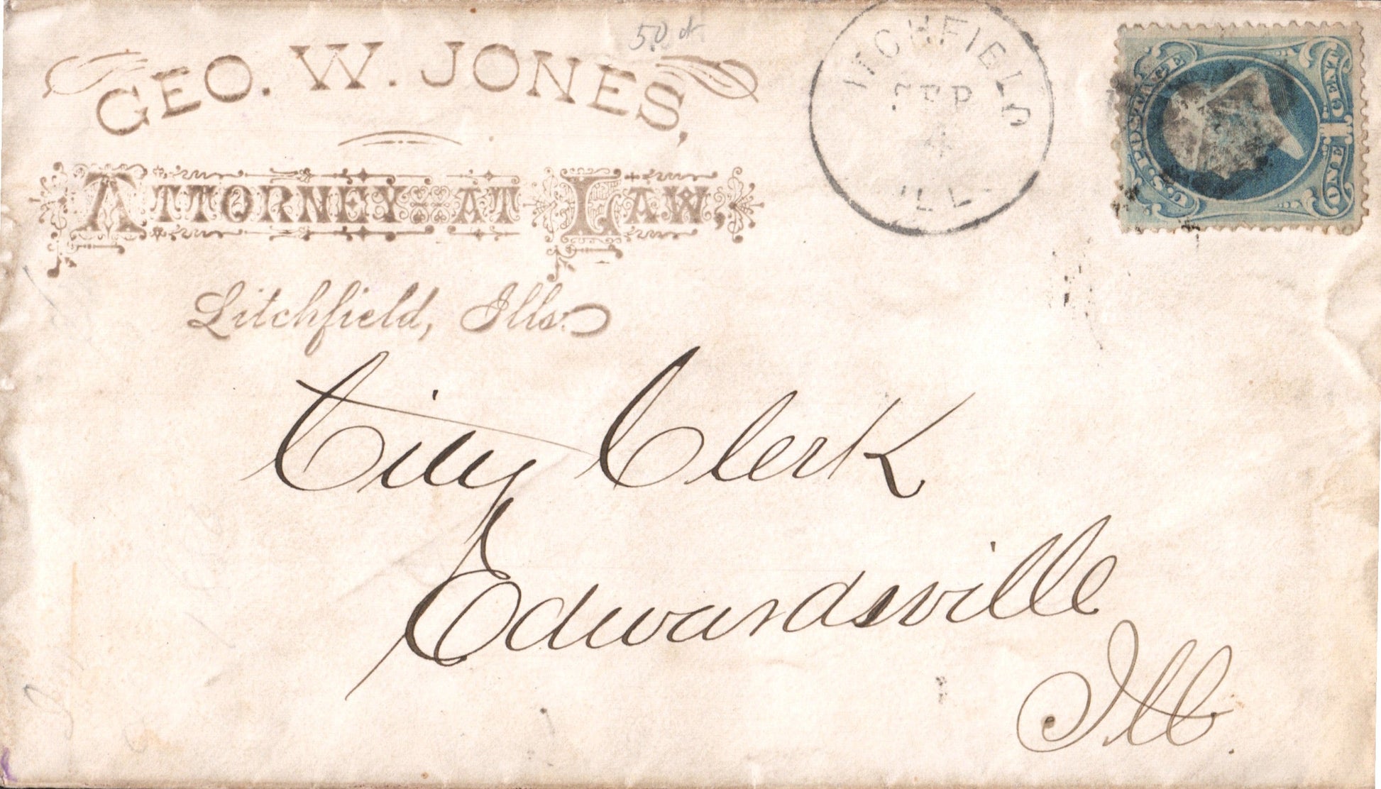 Litchfield light 1880 cds on cover attractive “Geo. W. Jones, Attorney at Law” corner, Edwardsville Ill. backstamp
