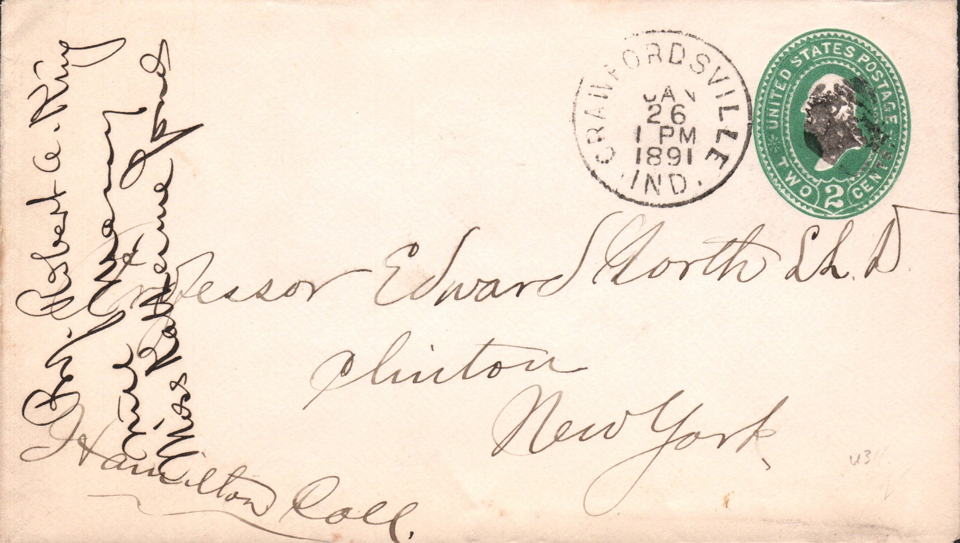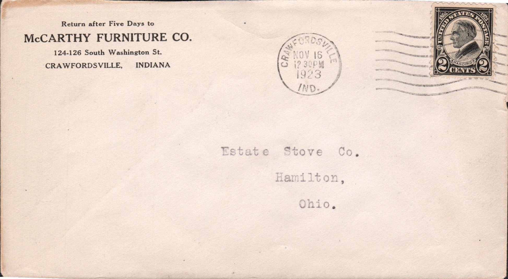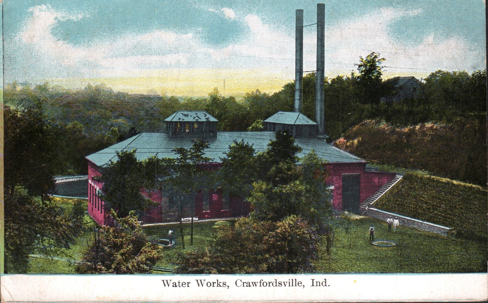 Crawfordsville 1870s cds and target killer on cover; 1891 cds on cover; 1909 duplex on post card, view of Water Works; 1923 machine cancel on cover, “McCarthy Furniture Co.” corner