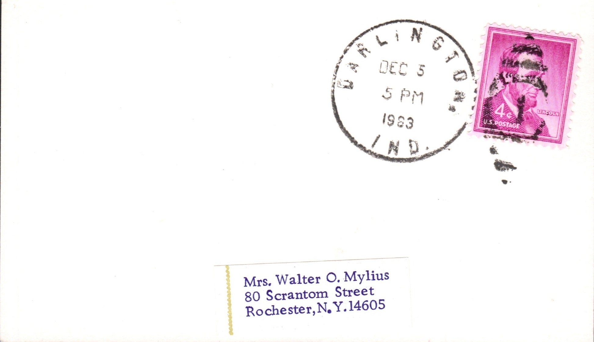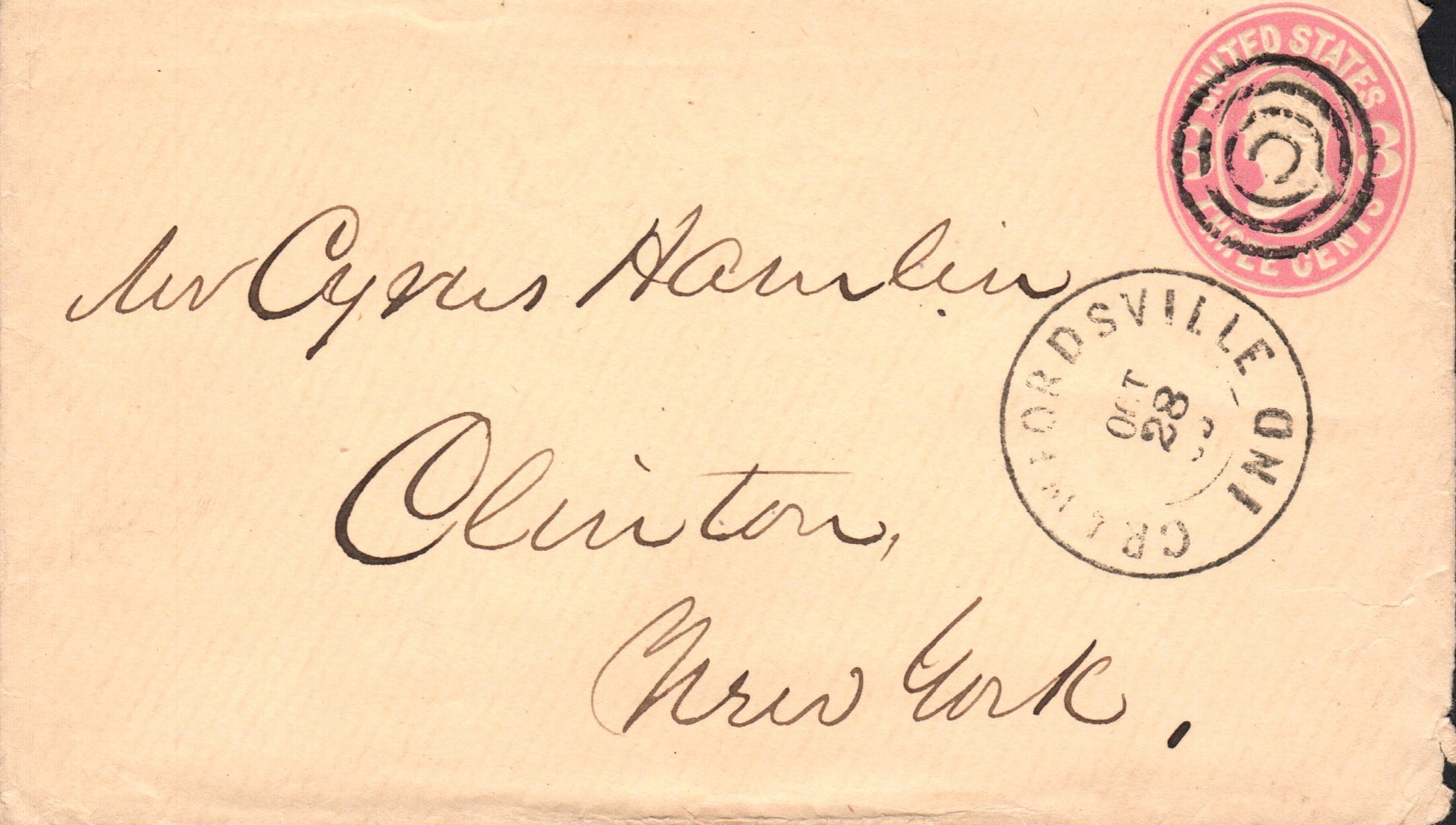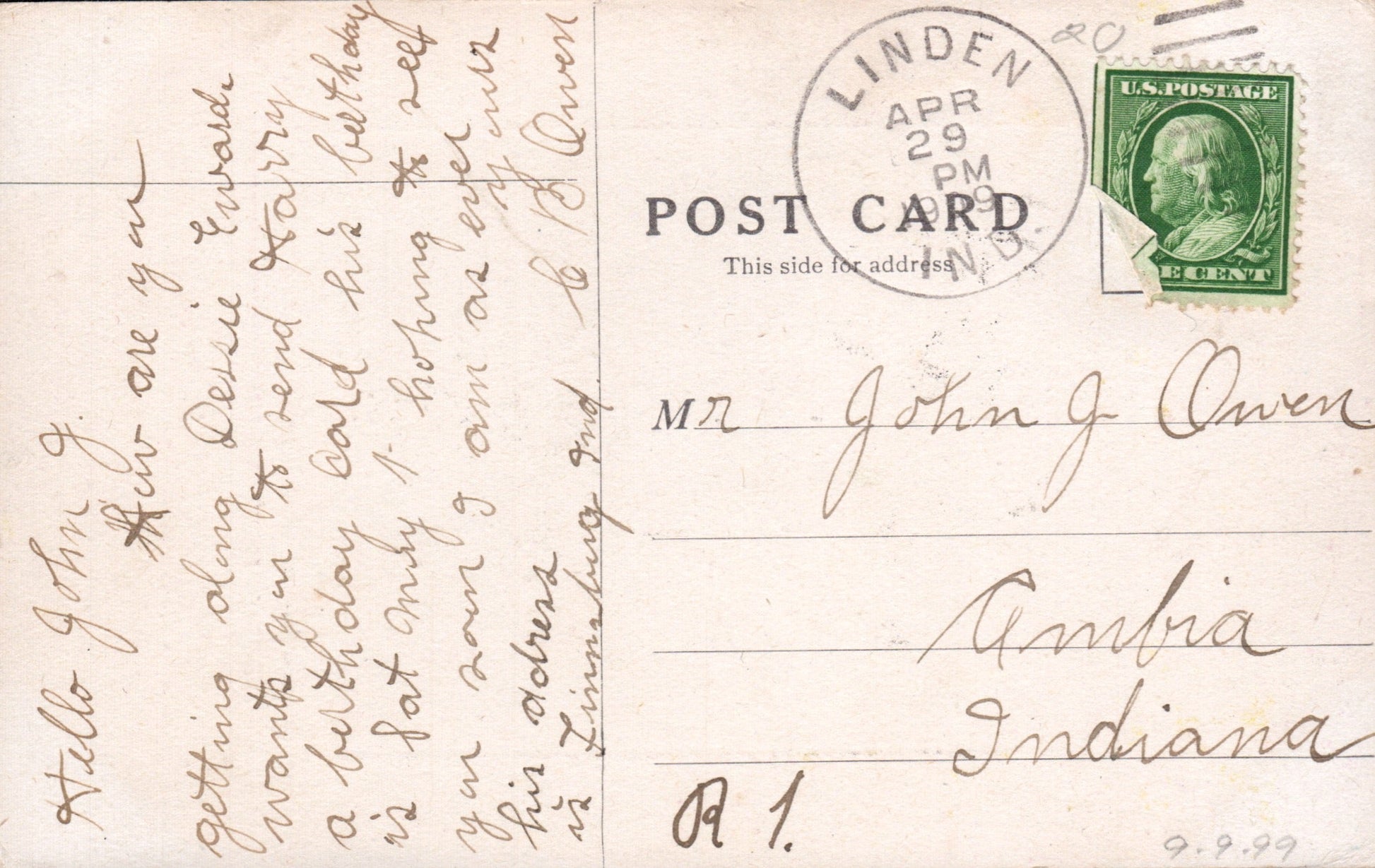 Crawfordsville 1870s cds and target killer on cover; 1891 cds on cover; 1909 duplex on post card, view of Water Works; 1923 machine cancel on cover, “McCarthy Furniture Co.” corner
