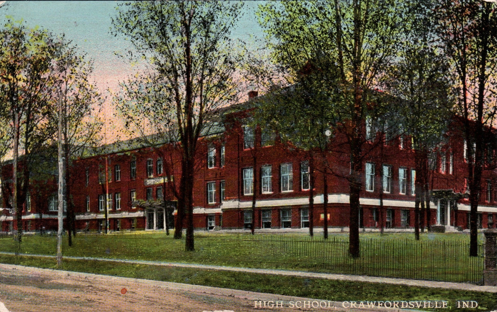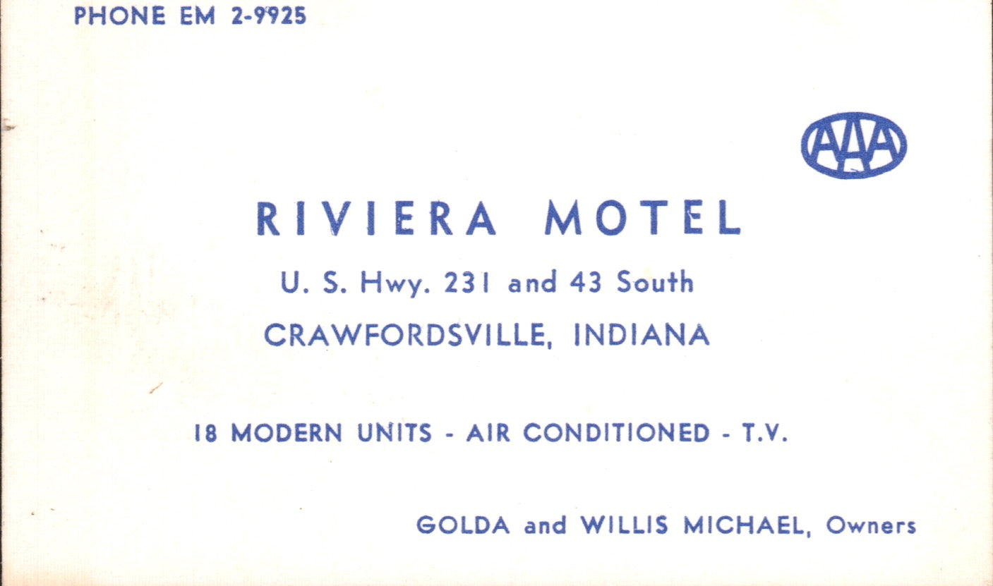 Post cards: High School [1912]; Wabash College [chrome]; Wabash College Goodrich Hall [chrome]; Old Yount Mill Inn [chrome]; General Lew Wallace Study [chrome]; Yount Woolen Mill [chrome]; Riviera Motel, view on business card