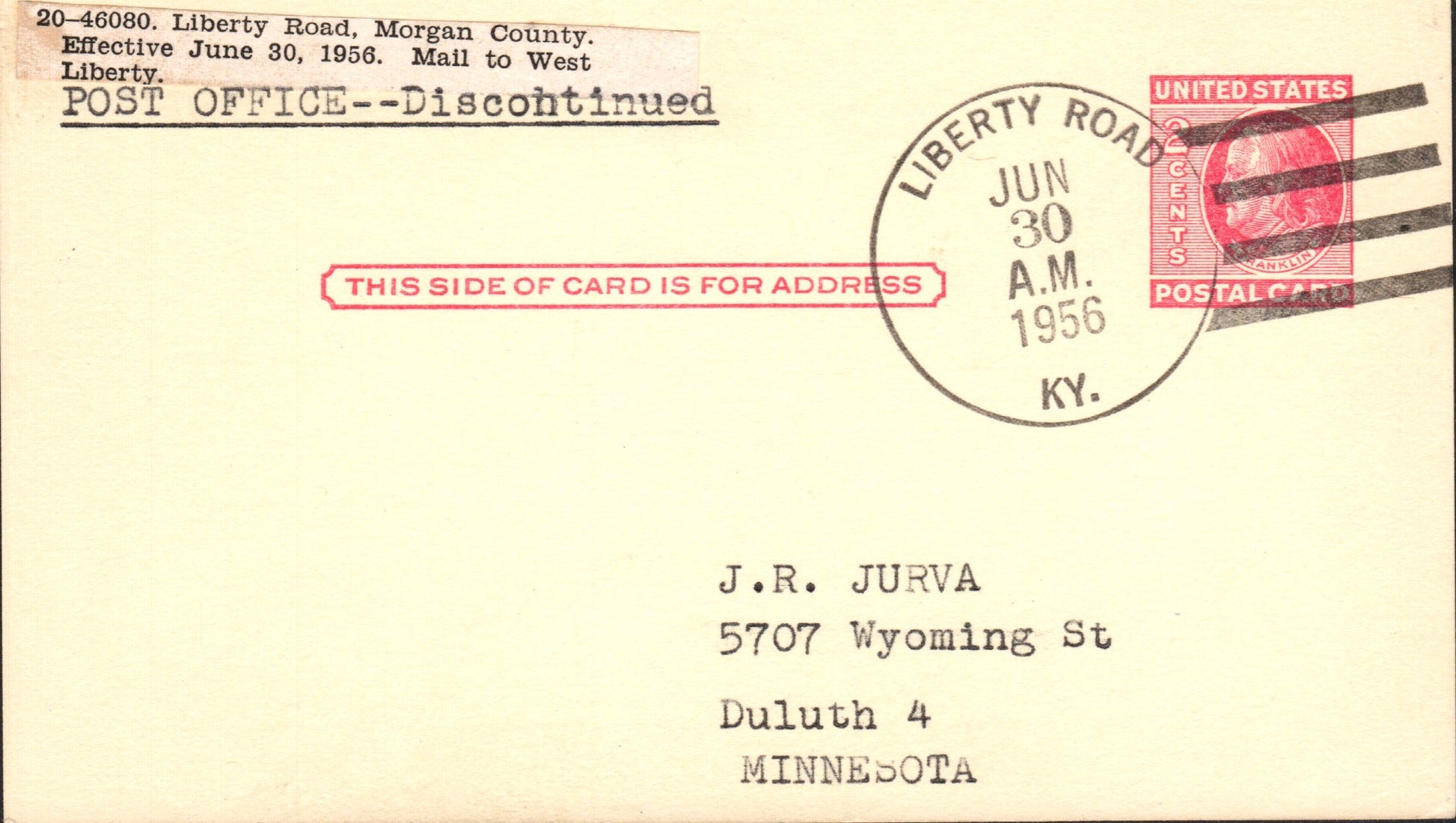 Liberty Road (1913-1956) 1956 4-bar on LD Postal Card