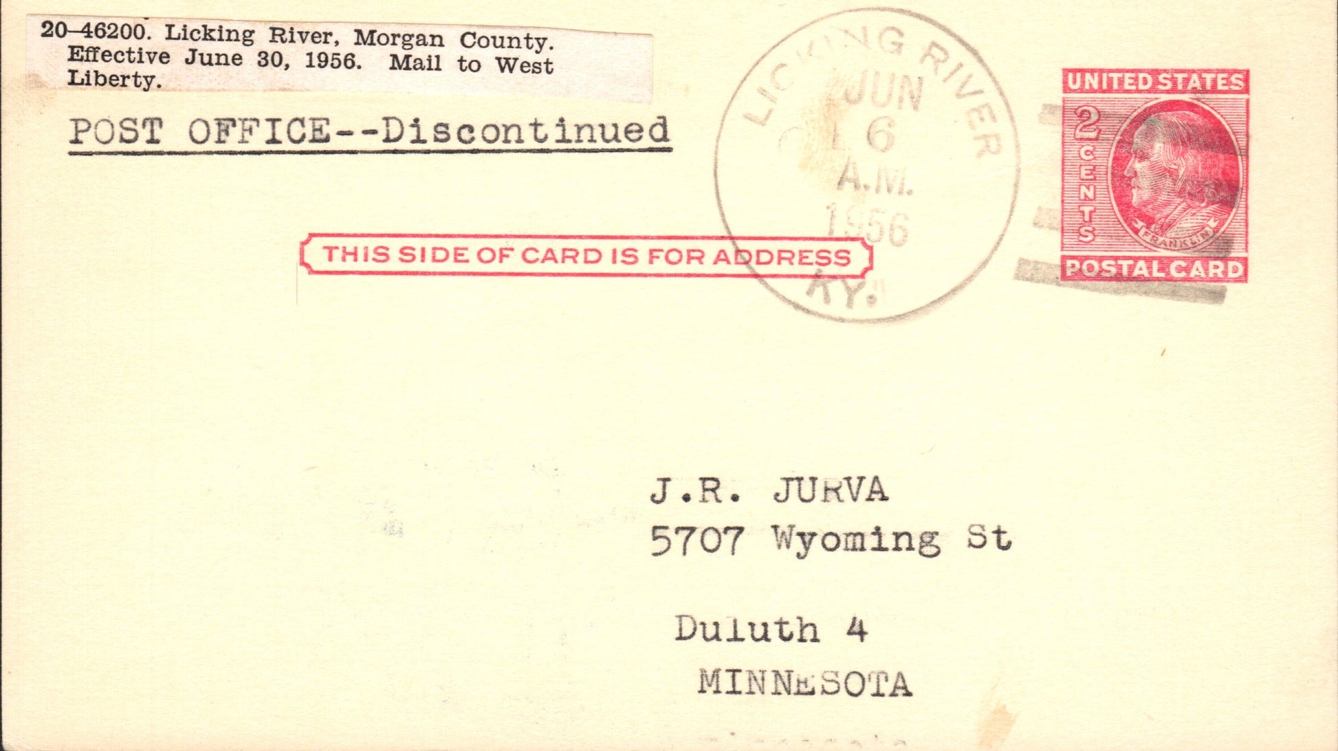 Licking River (1912-1956) 1956 4-bar on LD Postal Card
