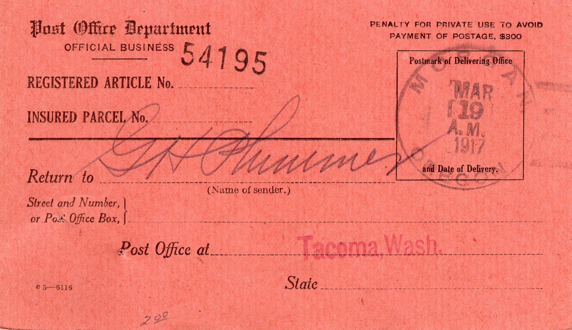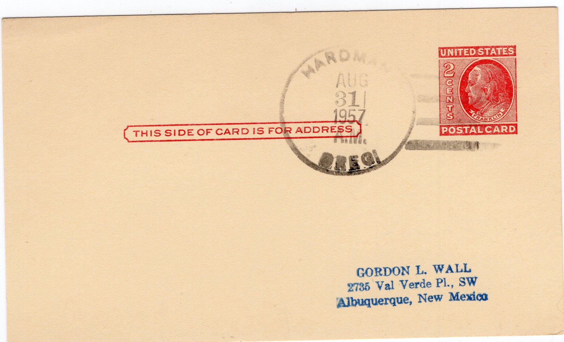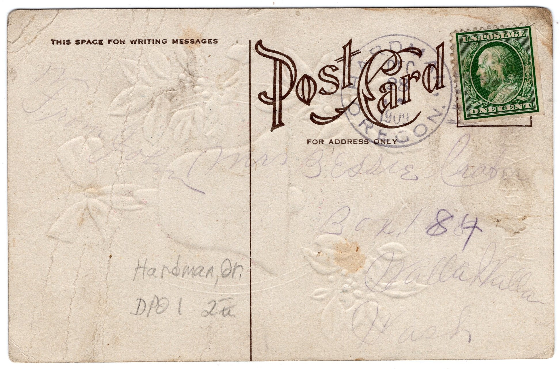 Hardman (1881/1957) 1909 Doane on post card; light 1957 4-bar on Postal Card