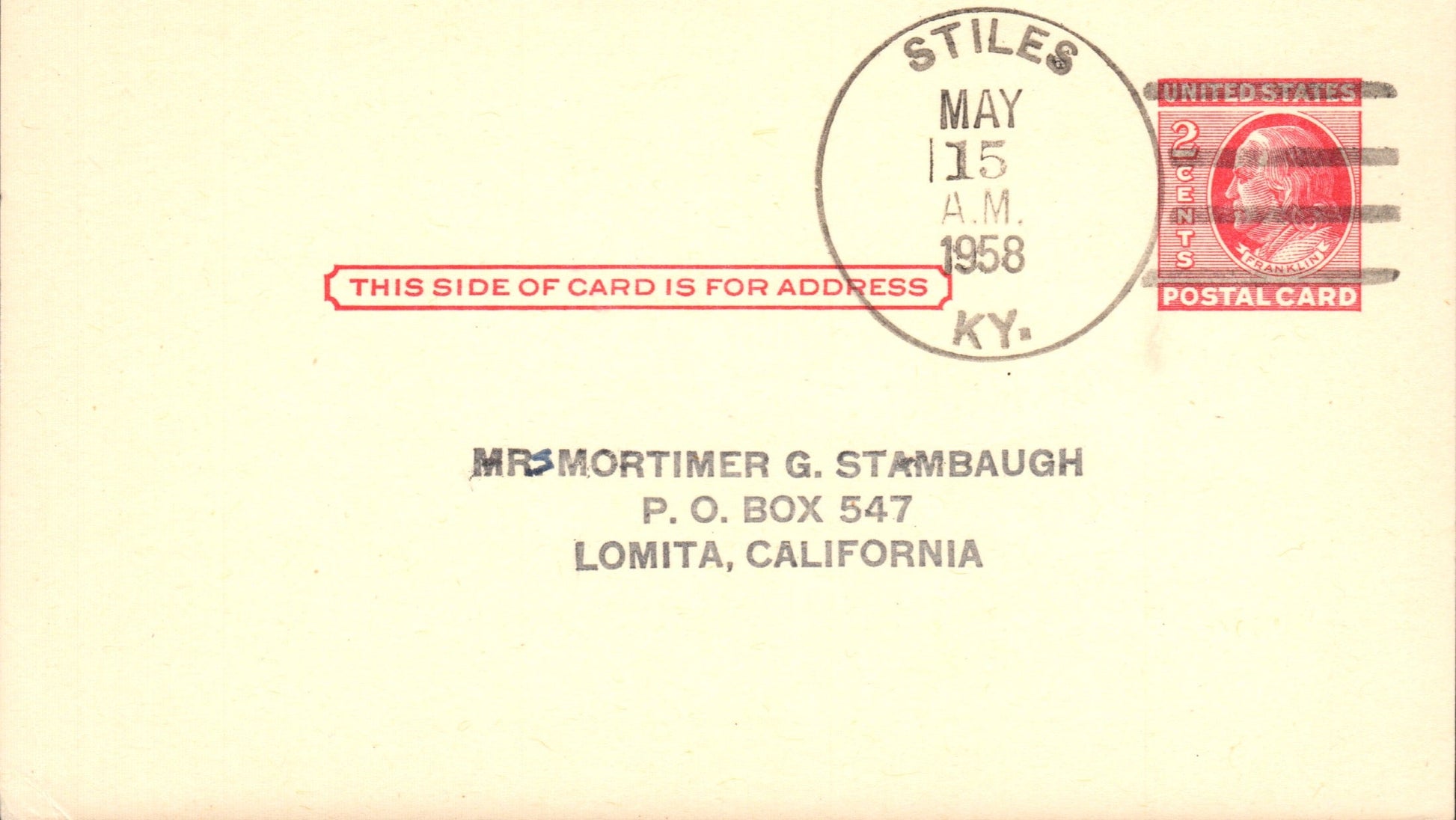Stiles (1905-1958) 1958 4-bar on Postal Card