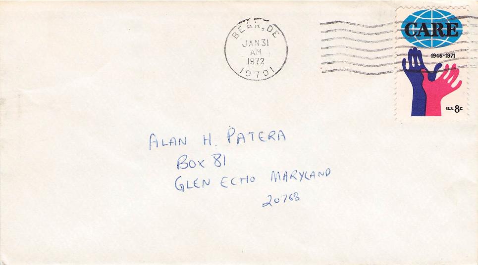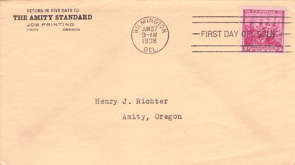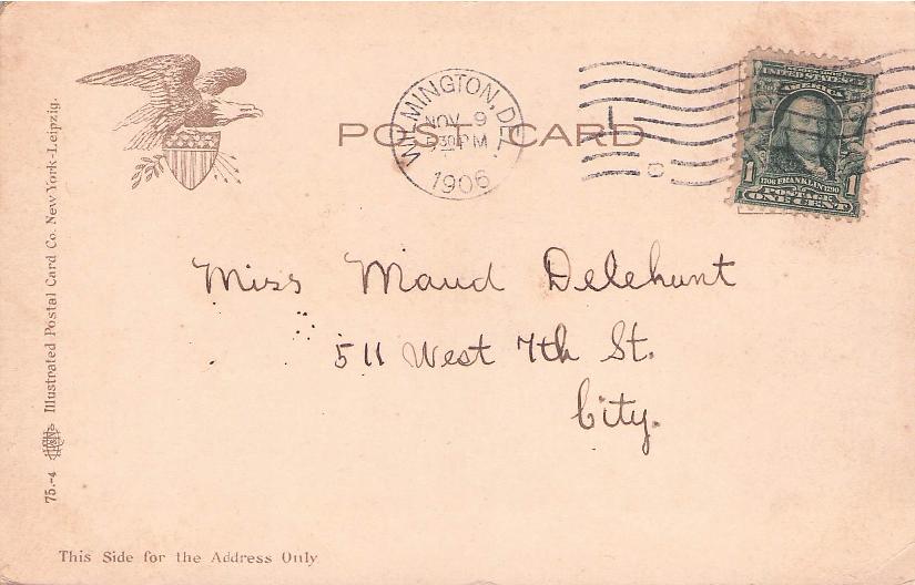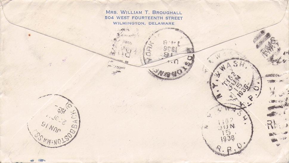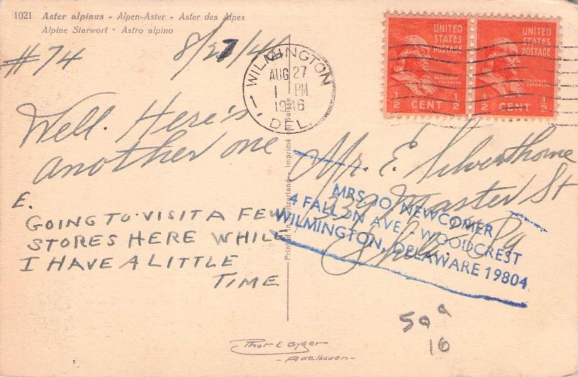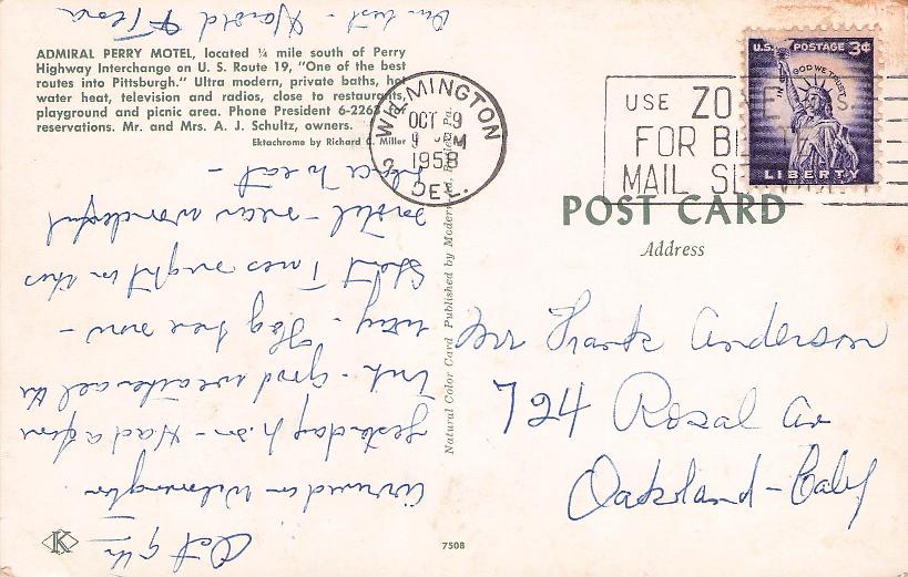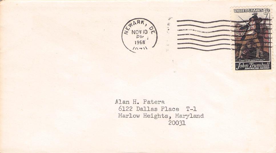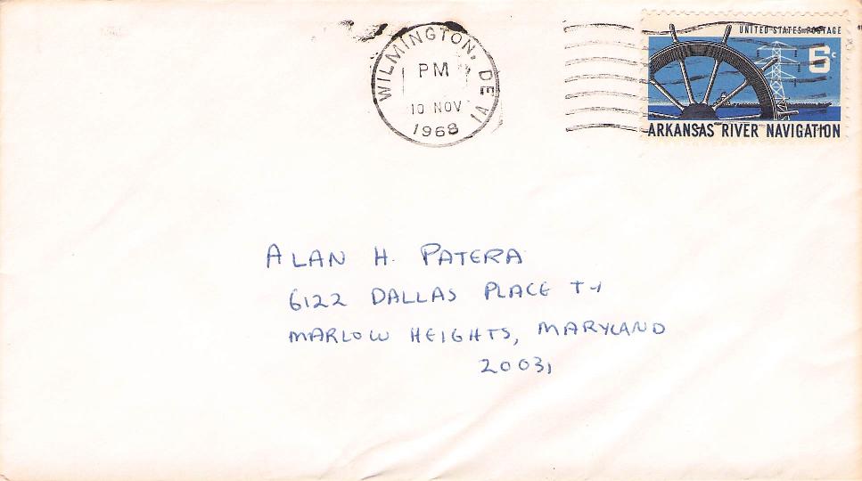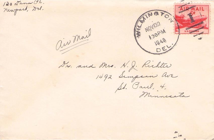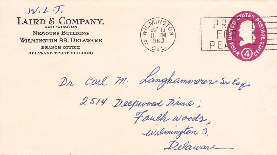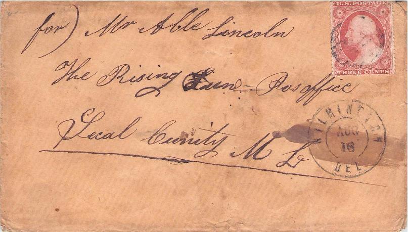 Wilmington Double circle cds on cover Aug 16, [no year date, c.1870-80], addressed to “Able Lincoln, The Rising Sun Posoffice [sic], [looks like Secal] Cecil County M.L. [Maryland]; c.1880 cds on cover; 1906 Rec’d strike on post card from Conn.; 1906 machine “c” on post card; 1936 Special Delivery cover with 12¢ postage, three Wilmington duplexes on front and four backstamps including R.P.O.; 1938 machine FD cover for “Landing of Swedes and Finns” stamp; 1946 machine cancel on post card; 1948 duplex “1” on Air Mail cover; 1958 slogan “Use Zone nos. for Better Mail Service” on post card, view of Admiral Perry Motel; 1960 “Pray for Peace” slogan on cover, “Laird & Co., Nemours Building” corner; 1968 machine cancel on cover