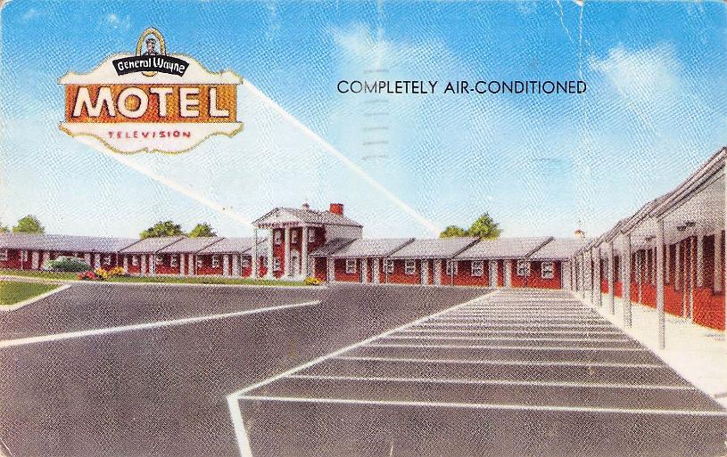 New Castle Post cards: Motel de Ville [chrome, 1958, tape mark & smudge on front; General Wayne Motel [chrome, 1958]; Amstel House [B&W]; Newcastle & Frenchtown RR Co. ticket booth [chrome]; Old Academy and Immanuel Church [chrome]