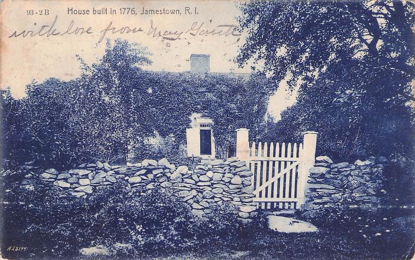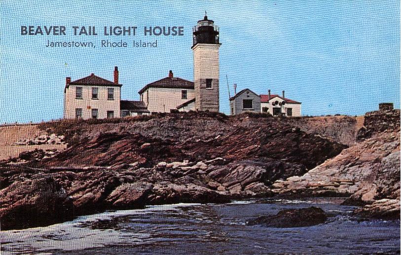 - Jamestown Post cards: “Along the Shore at Beaver Tail” [white border]; “House built in 1776” [1907 Riverside R.I. Rec’d on back]; Beaver Tail Light House [chrome]; Jamestown Bridge [chrome]
