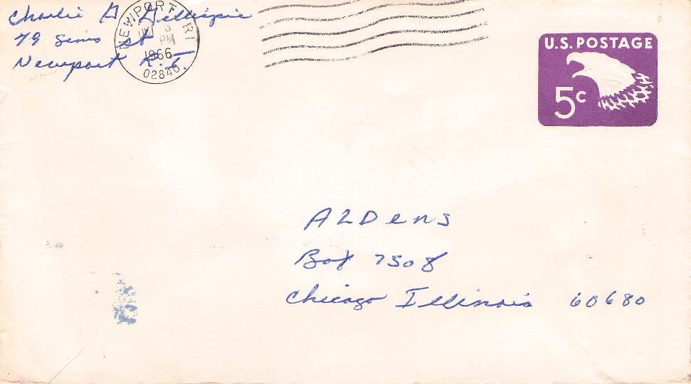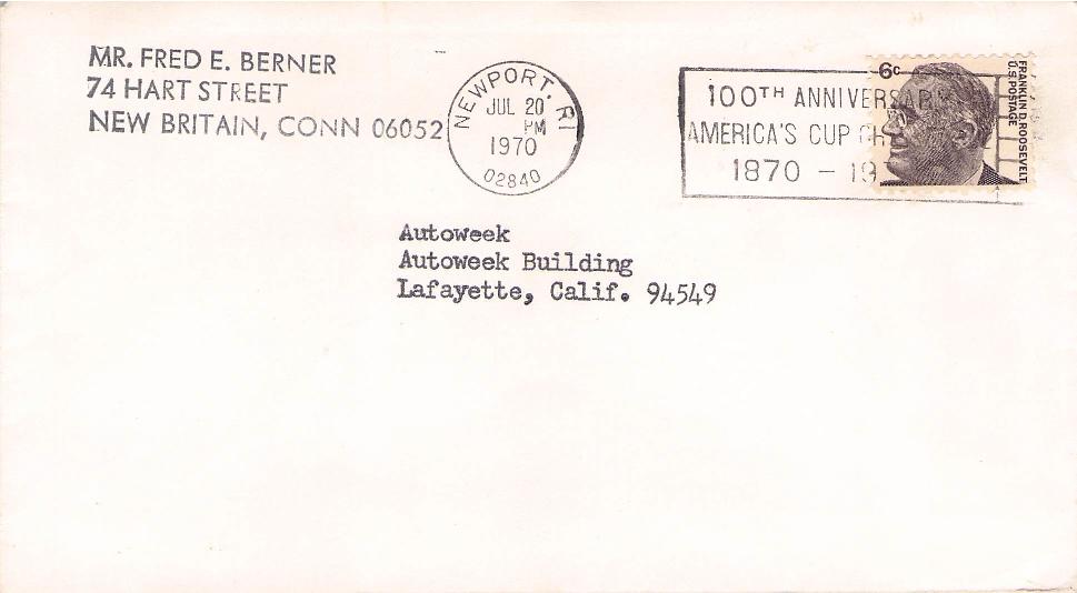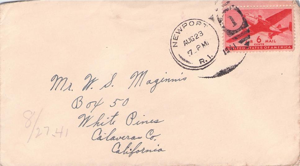 - Newport 1897 Flag cancel on worn cover; 1941 duplex on cover, 6¢ Air Mail stamp; 1941 machine cancel on cover, 6¢ Air Mail; 1966 machine cancel on cover, went through machine crooked; 1970 machine slogan “100th Anniversary America’s Cup” on cover; 1976 cds on cacheted cover honoring William Ellory.