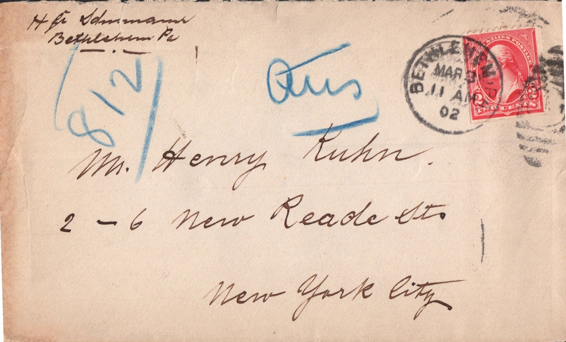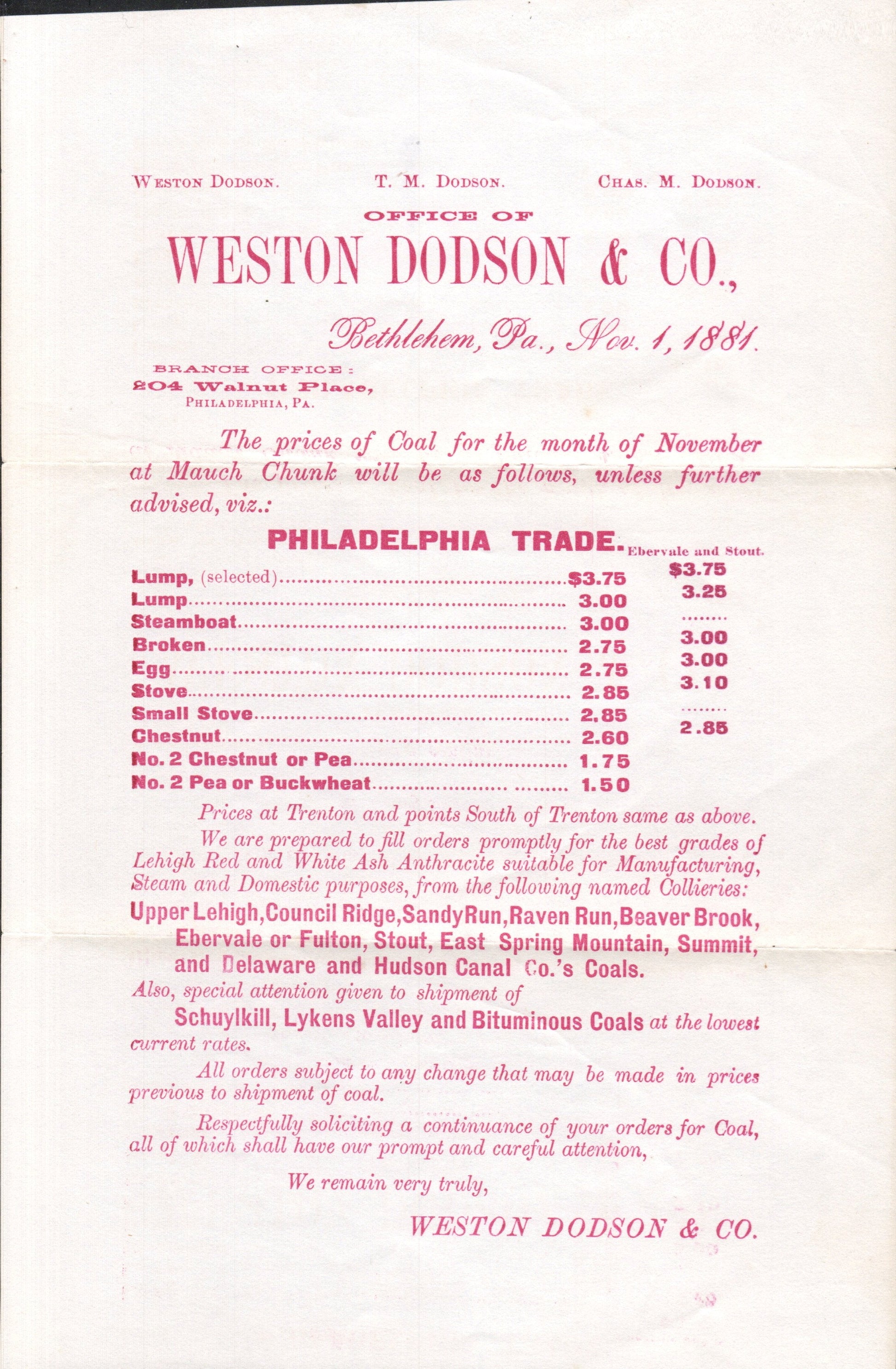 Bethlehem 1881 cds on cover, “Weston, Dodson & Co.” corner, original enclosure gives coal prices; 1902 duplex on cover