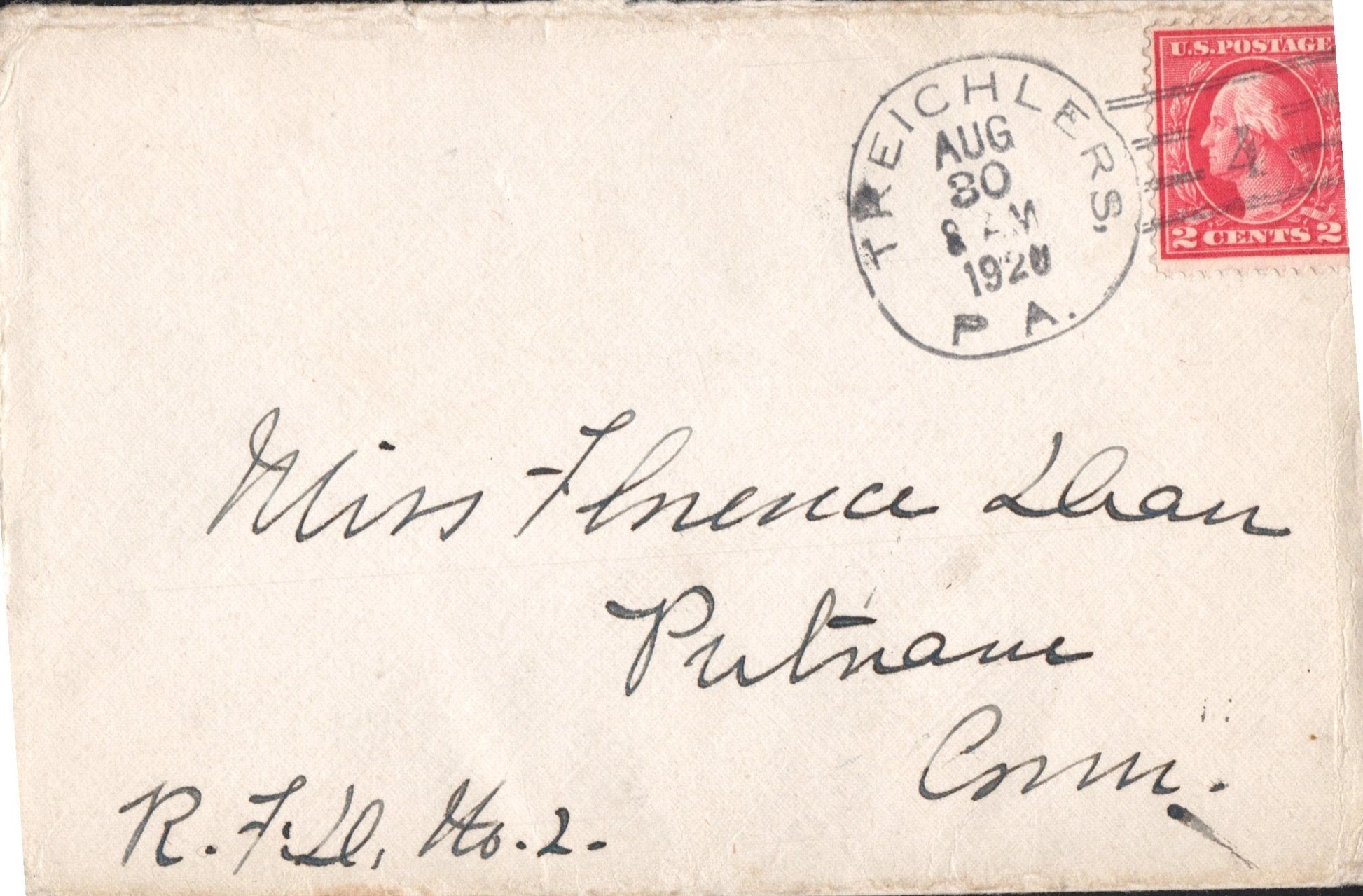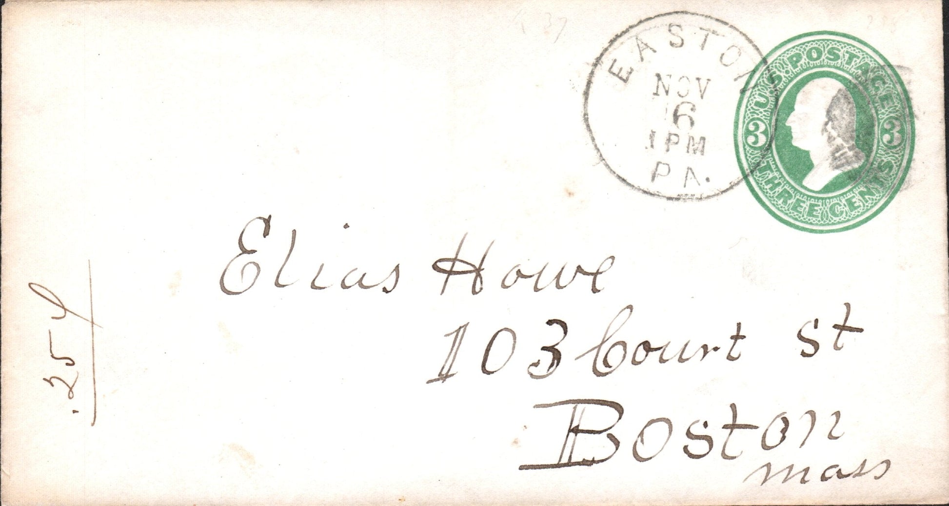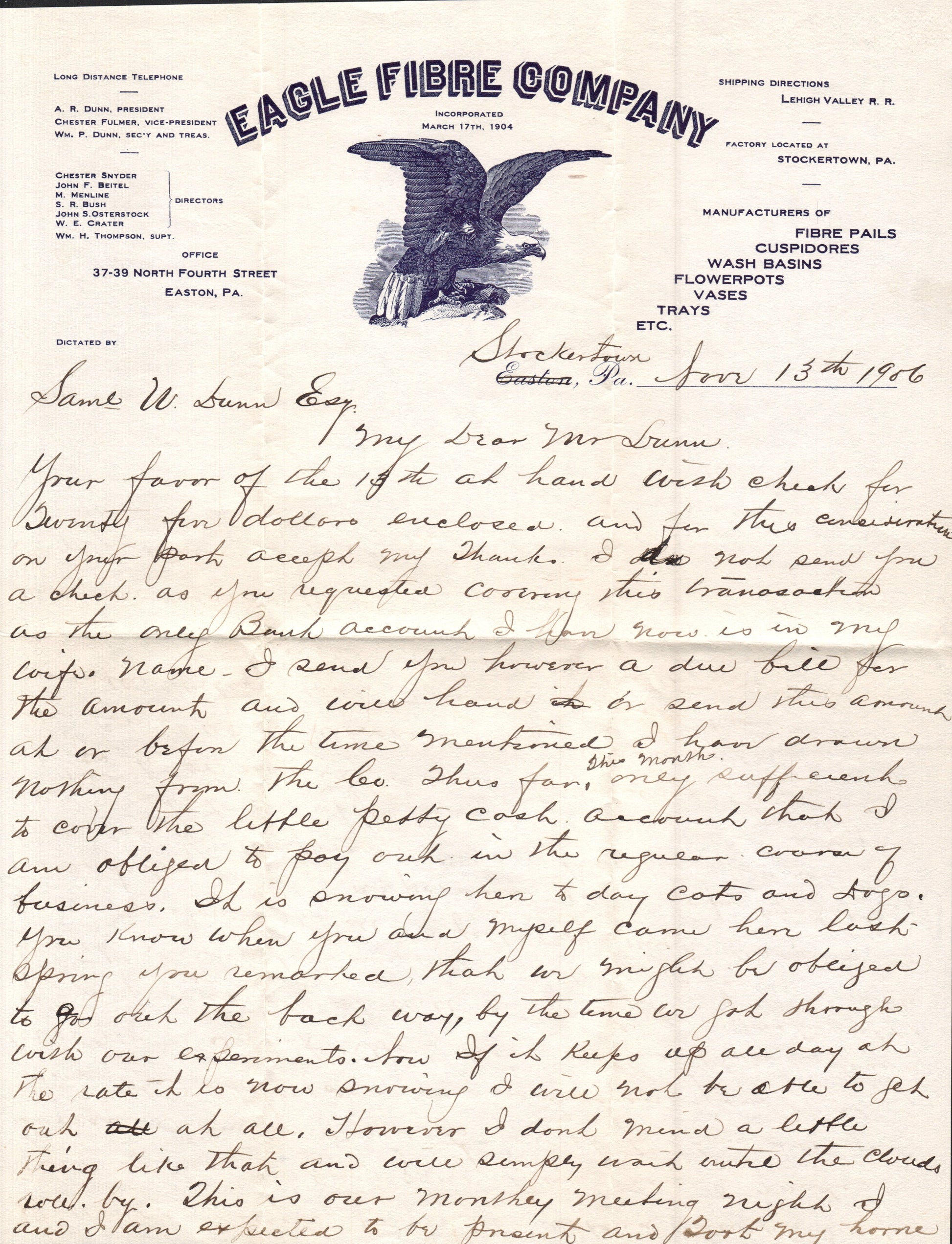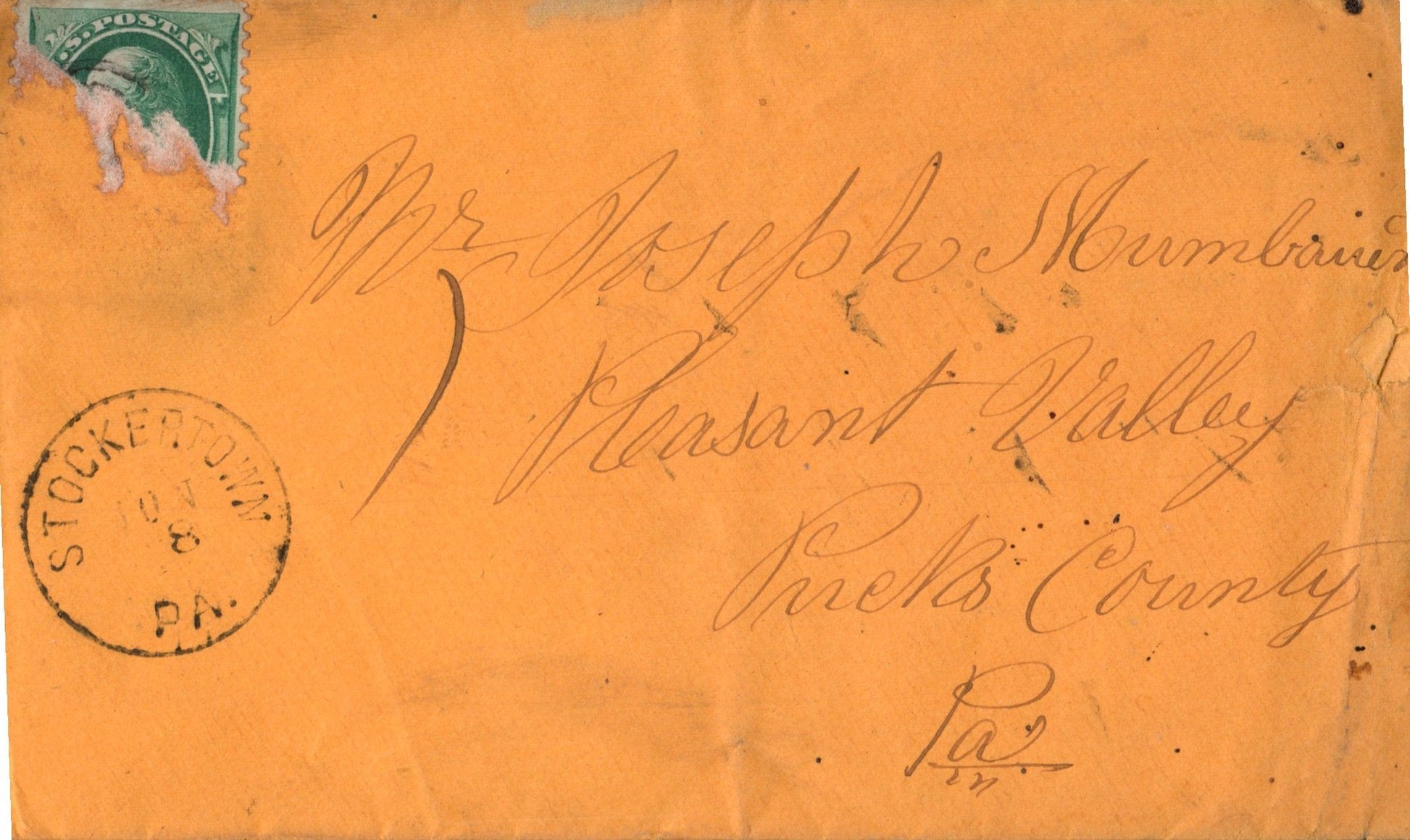Stockertown 1870 cds on cover, stamp partly ripped off, includes original letter; 1906 duplex on cover, Eagle Fibre Co. corner and eagle emblem as background, includes original letter on letterhead stationery; 1923 4-bar on post card