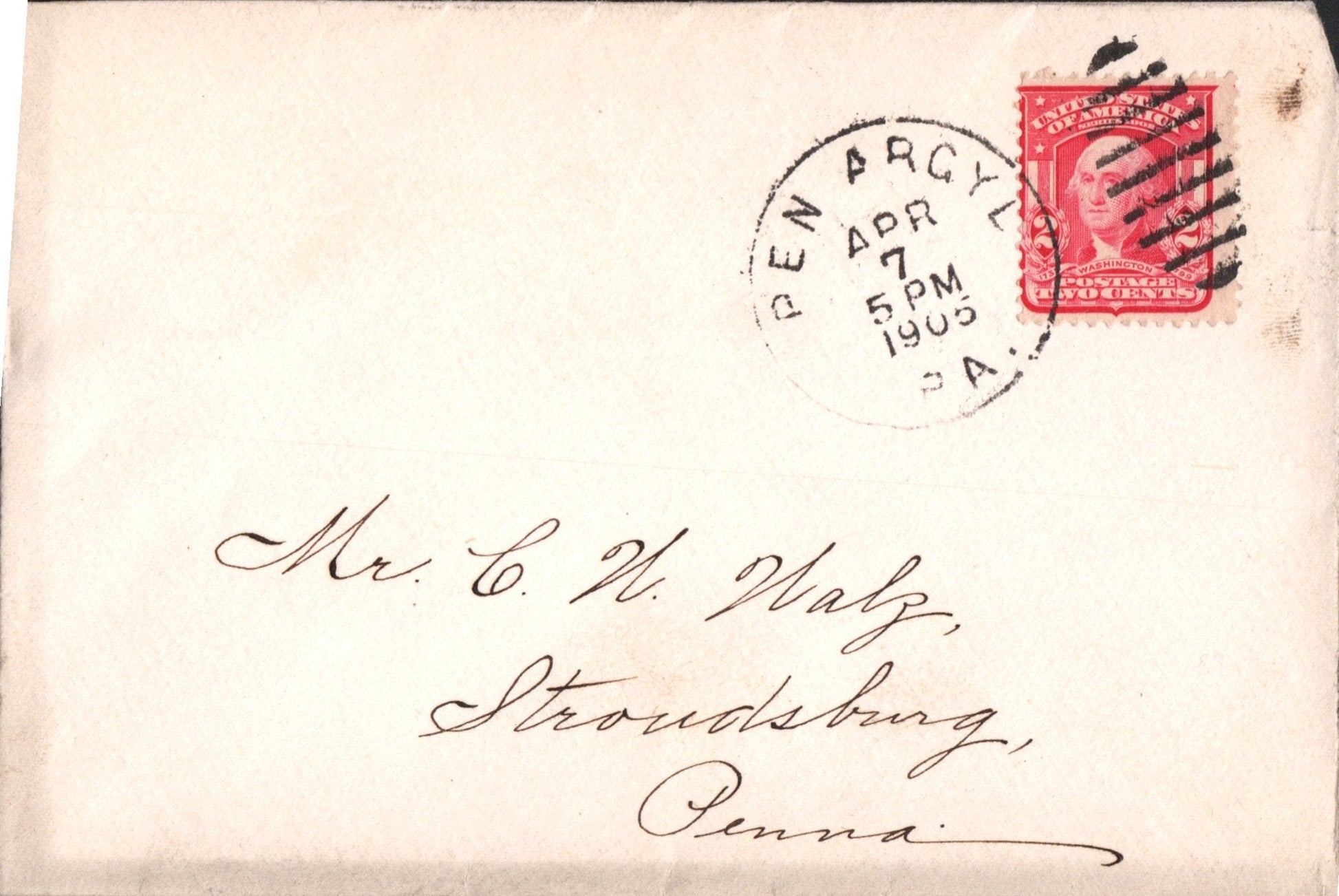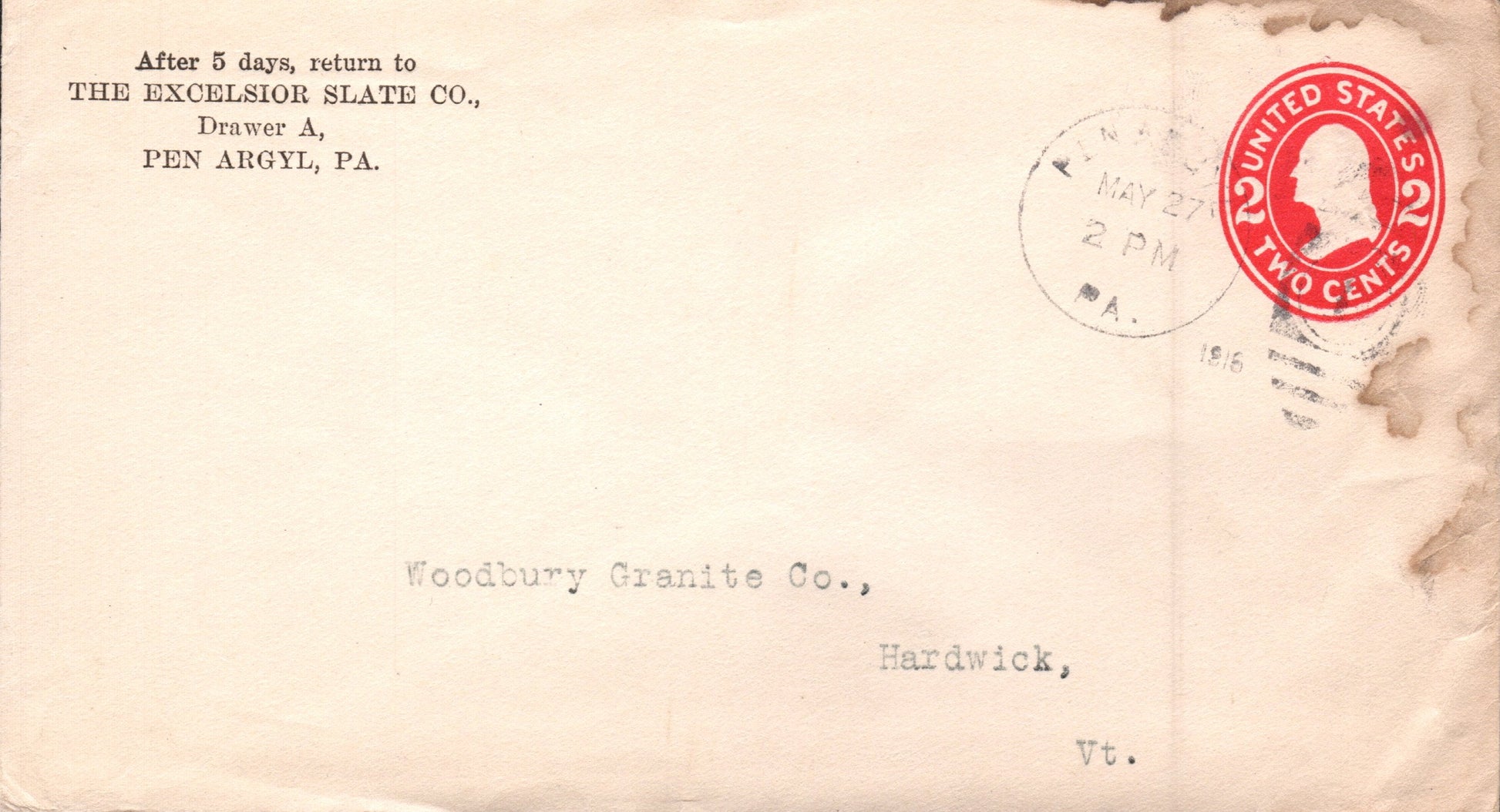 Pen Argyl 1905 duplex on cover; light 1916 date-out duplex on stained cover, “The Excelsior Slate Co.” corner; 1941 duplex on red cover