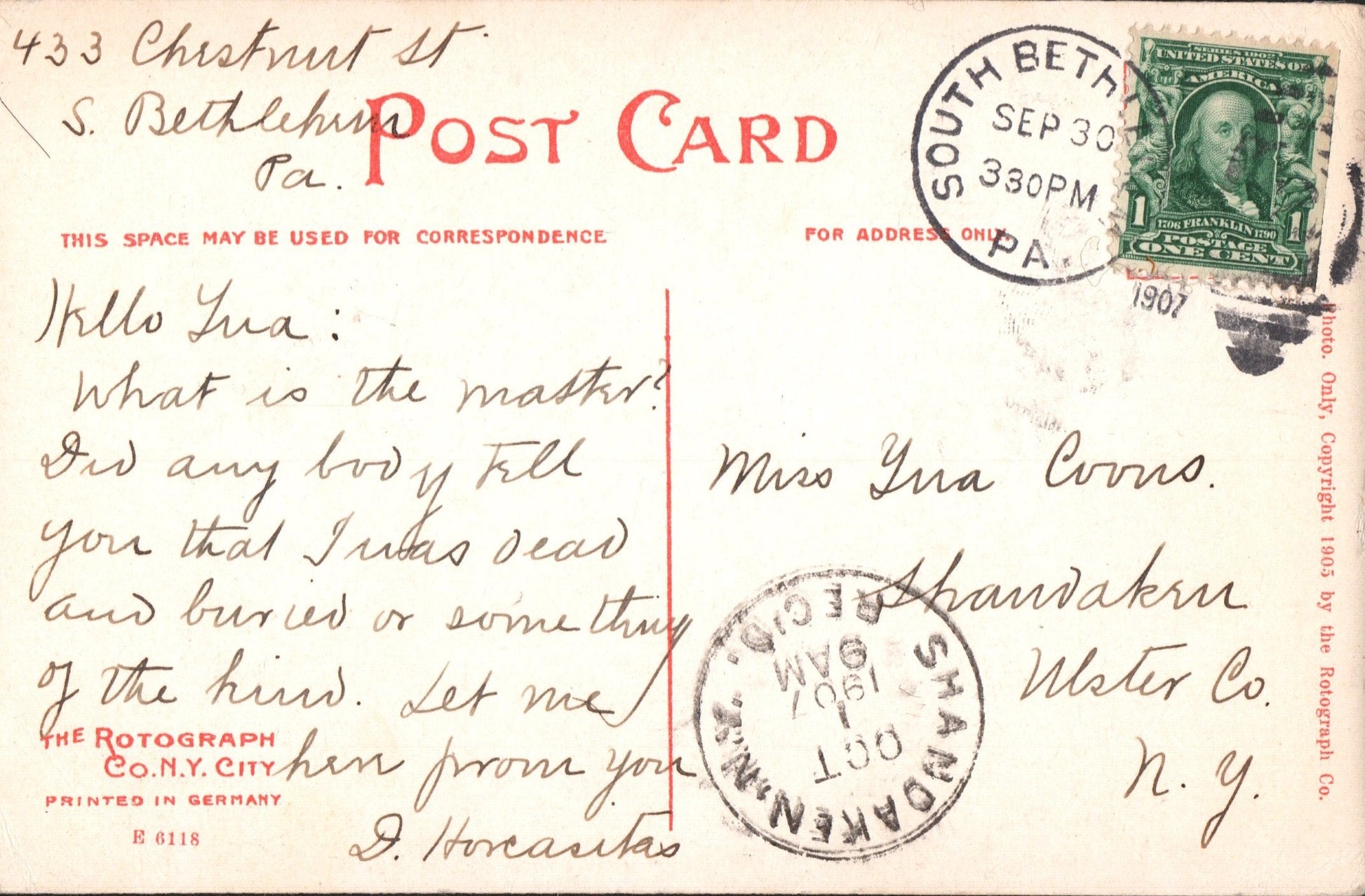 South Bethlehem (1866-1915) 1905 machine cancel on post card; 1907 date-out duplex on post card, Lehigh U. Gymnasium. also Shamokin Rec’d