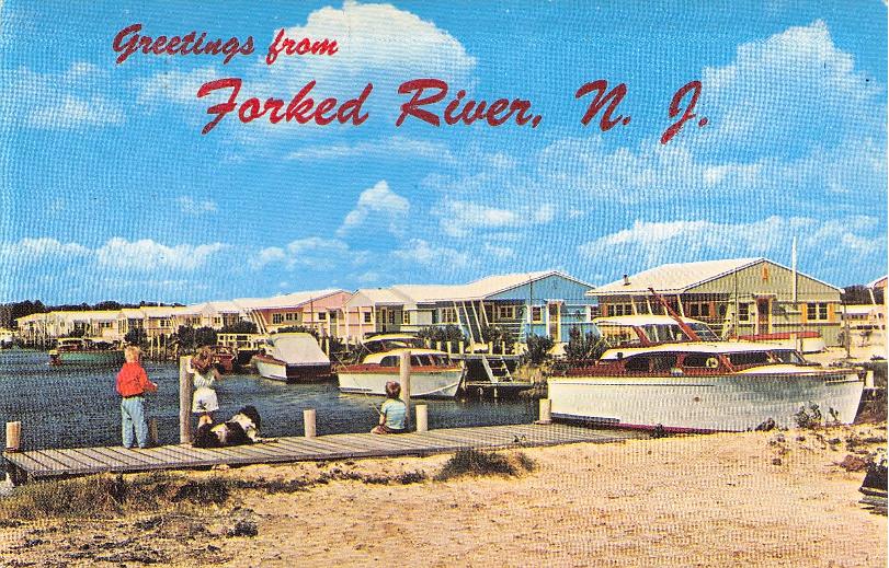 Forked River 1969 machine cancel on post card, “Greetings from Forked River” showing boats & houses