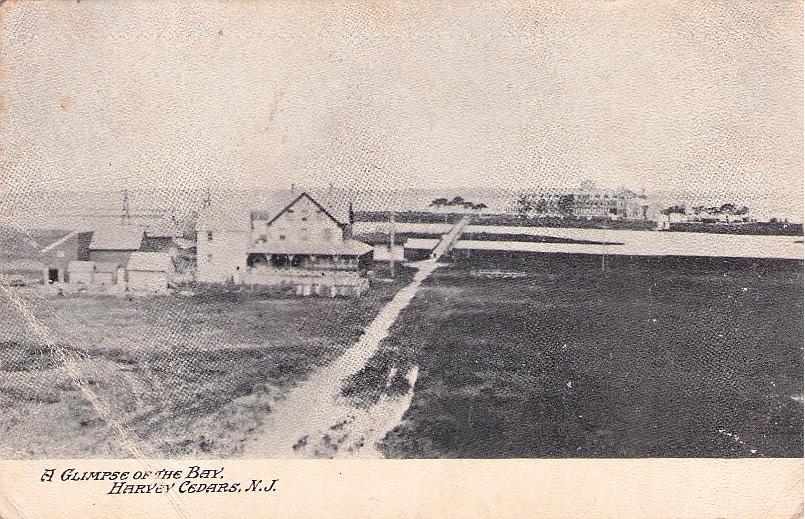 Harvey Cedars Post card: 1908 view showing a few buildings by the bay, crease
