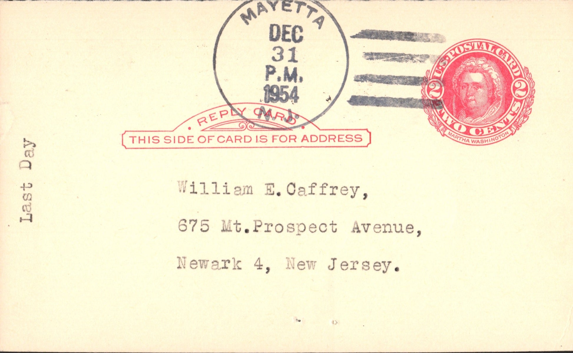 Mayetta (1890-1954) 1954 4-bar on Postal Card