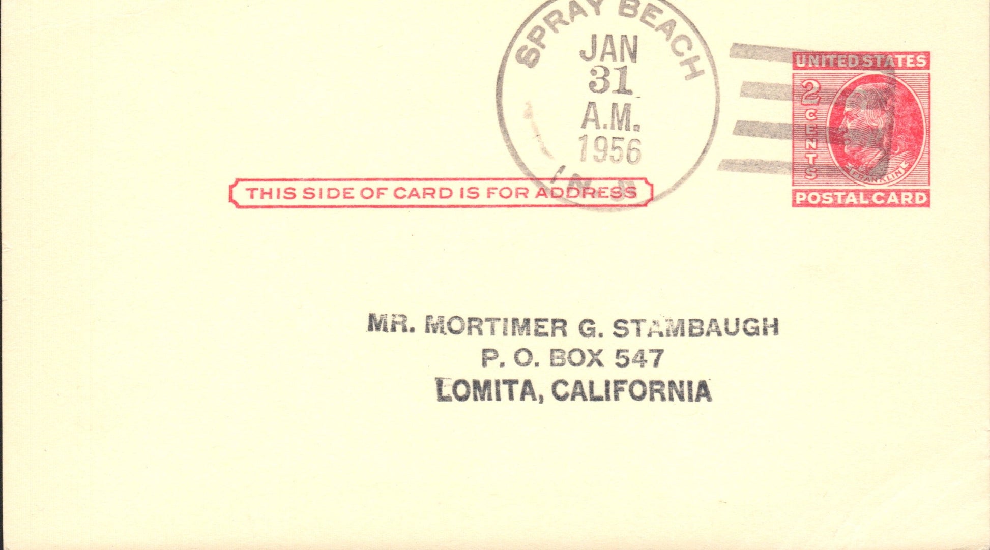 Spray Beach (1939-1956) 1956 4-bar on Postal Card