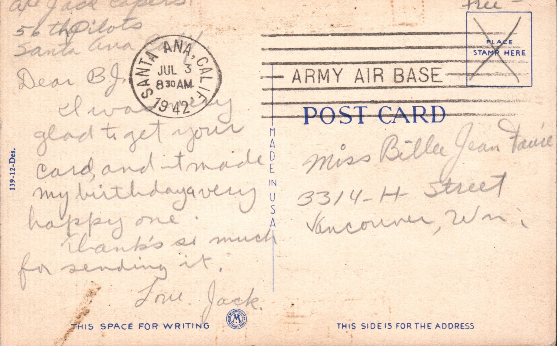 Army Air Base (Santa Ana) (1942-1946) 1942 machine cancel on post card, soldiers “Free” mail