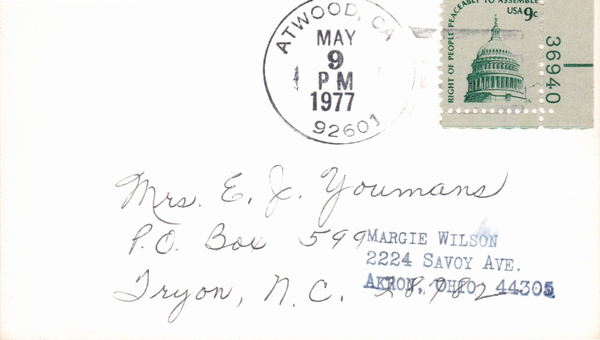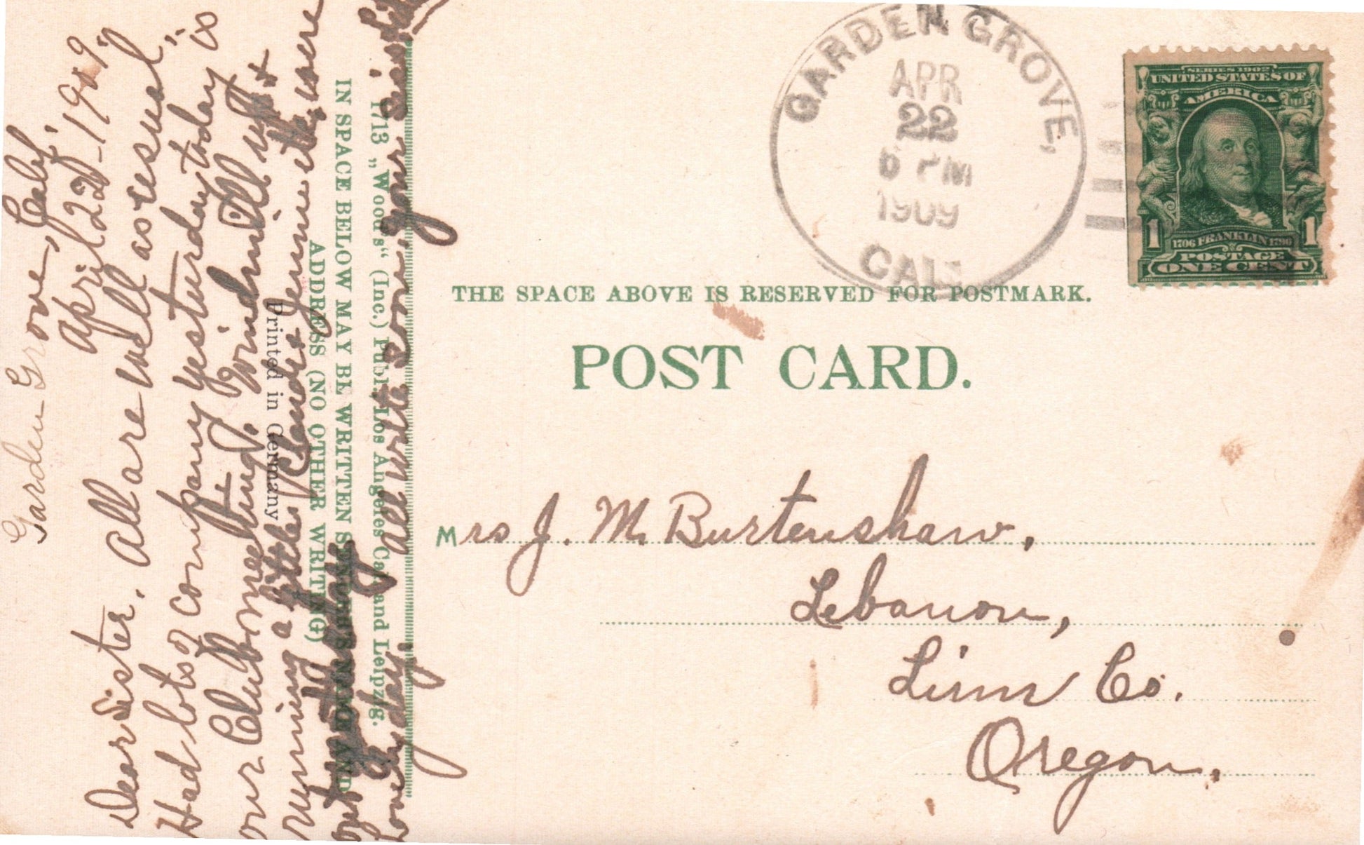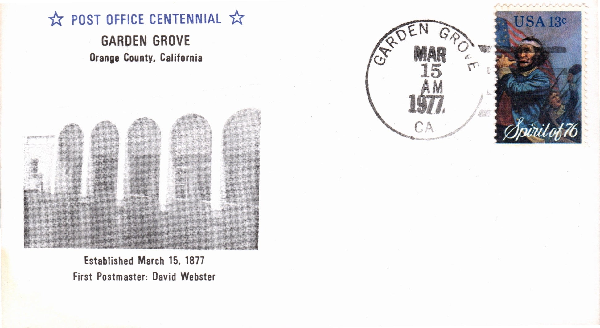 Garden Grove 1909 4-bar on post card; 1977 4-bar on cacheted cover [photo of p.o.] Centennial cover