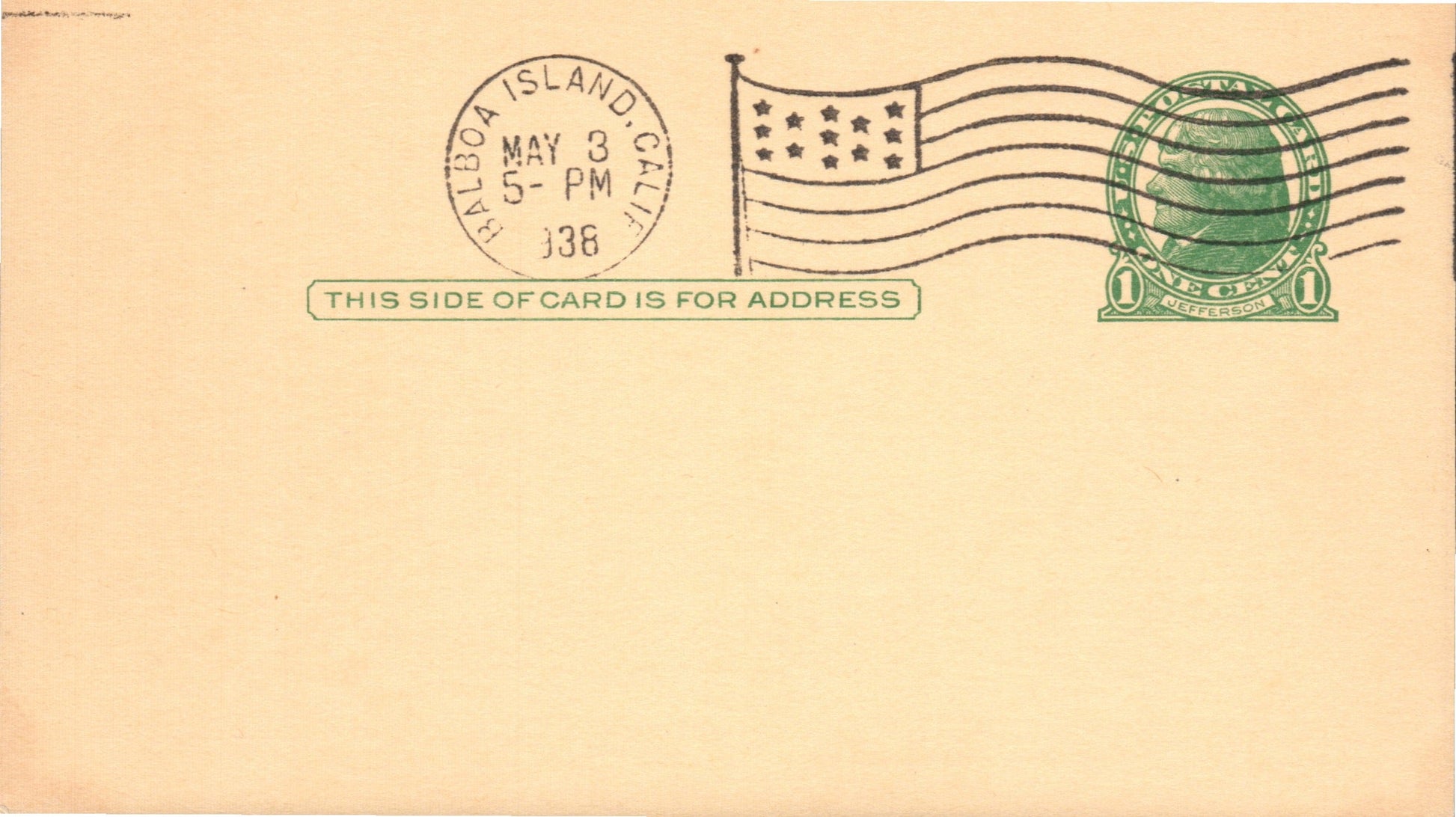Balboa Island (1928-1955) 1938 Flag cancel on Postal Card