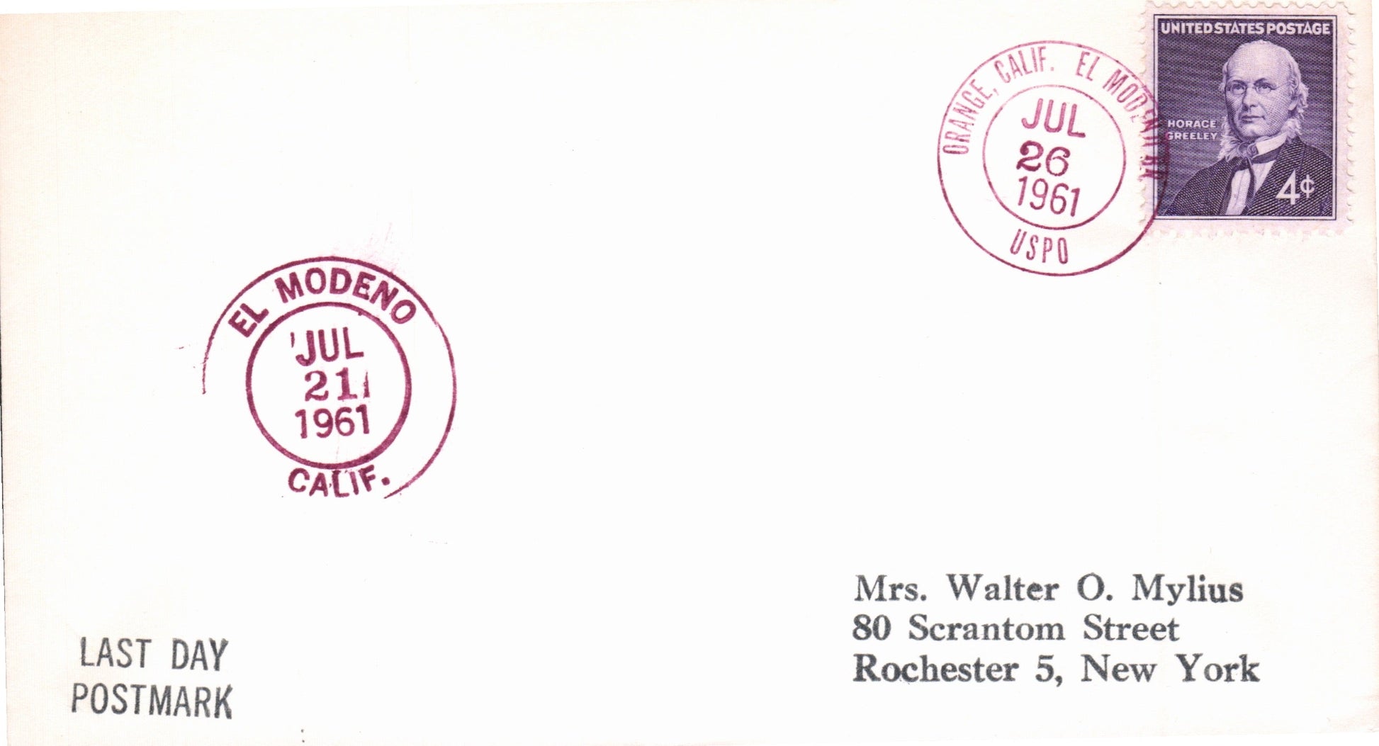 El Modeno (1910-1961) 1939 4-bar as rec’d backstamp on cover from Oakland; 1961 round dater on LD cover