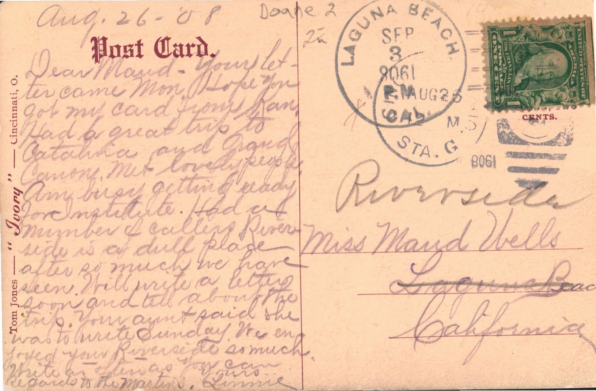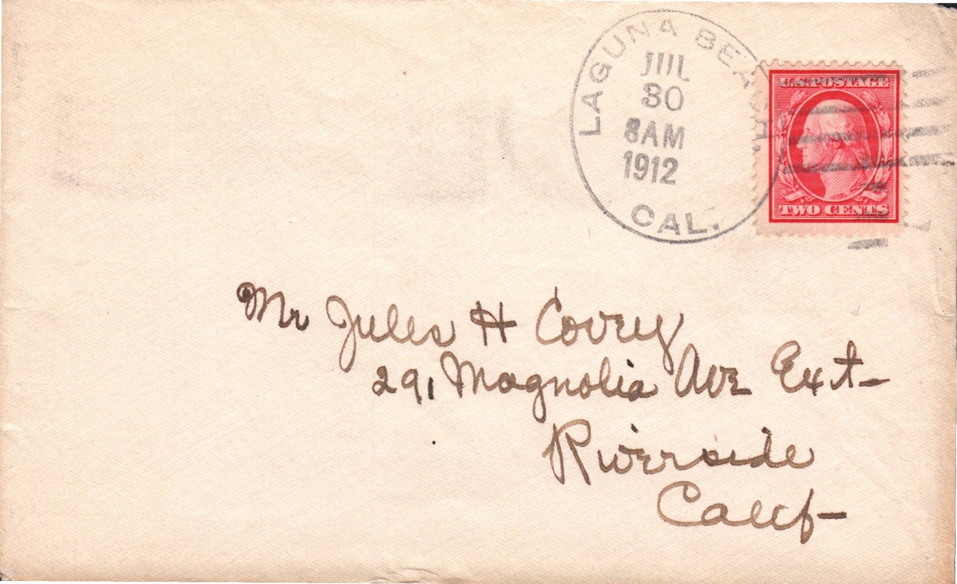 Laguna Beach 1908 Doane as rec’d over L.A. Sta, G on post card; 1912 4-bar on cover