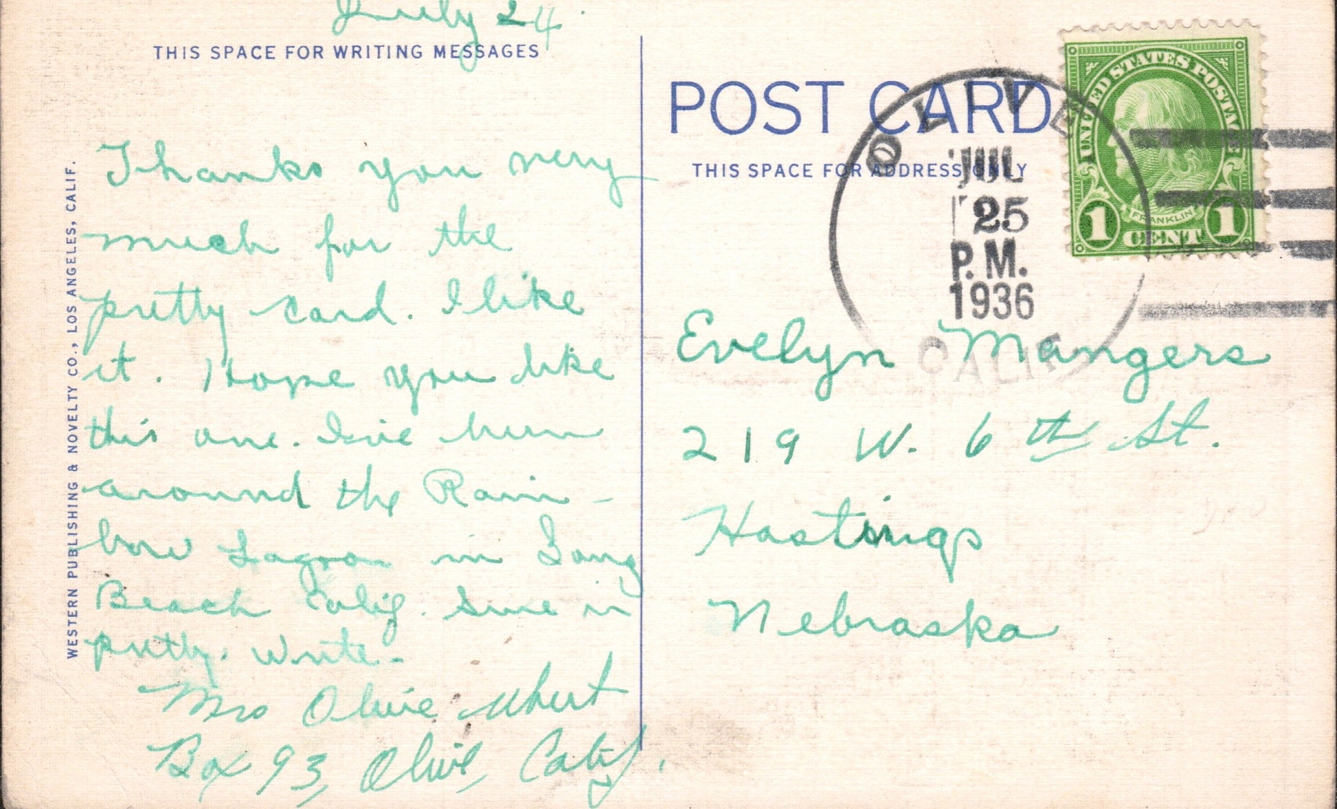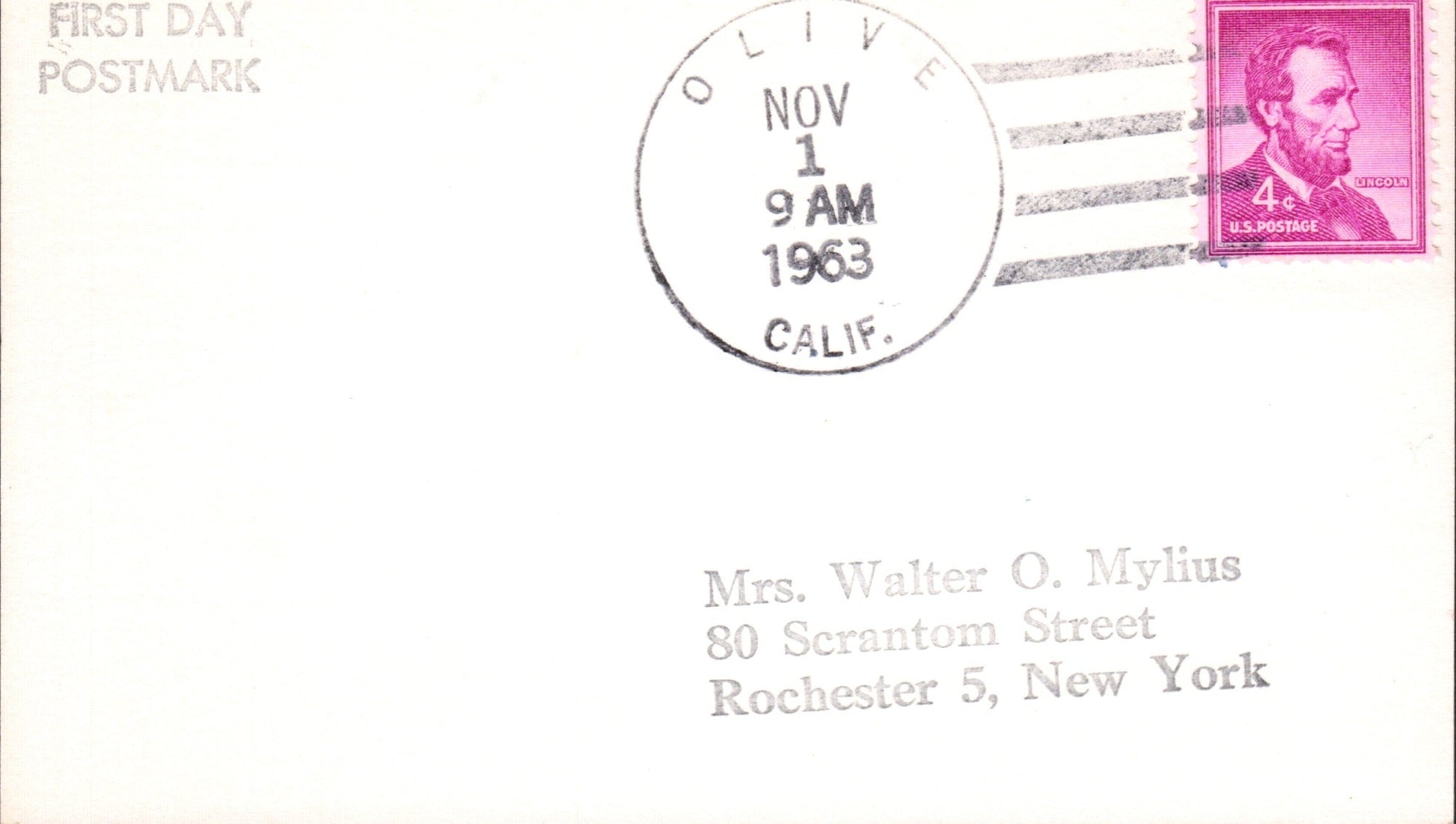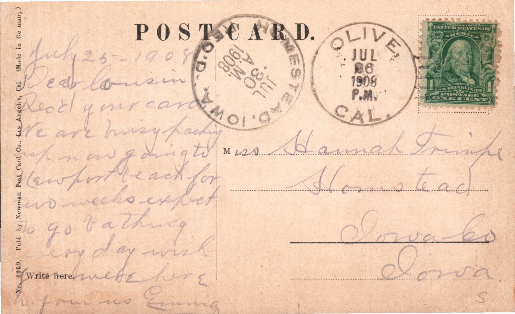 Olive (1887/1963) 1908 4-bar on post card, also Homestead IA Rec’d; 1936 4-bar on post card; 1963 4-bar on 3x5 card (as Sta.)