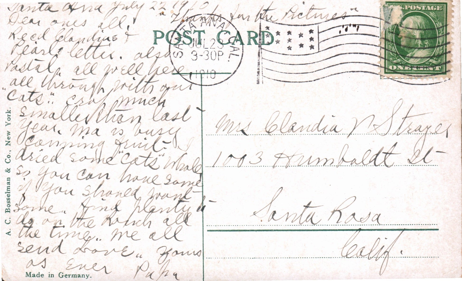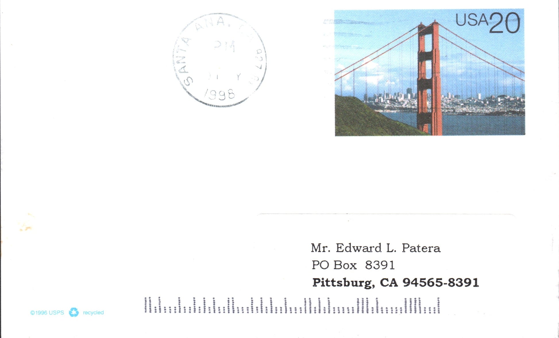 Santa Ana 1910 Flag cancel on post card; 1998 machine cancel on Postal Card
