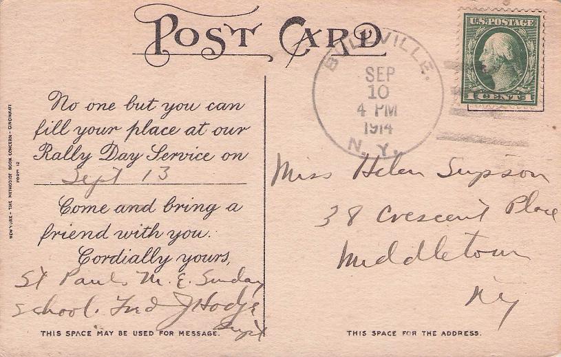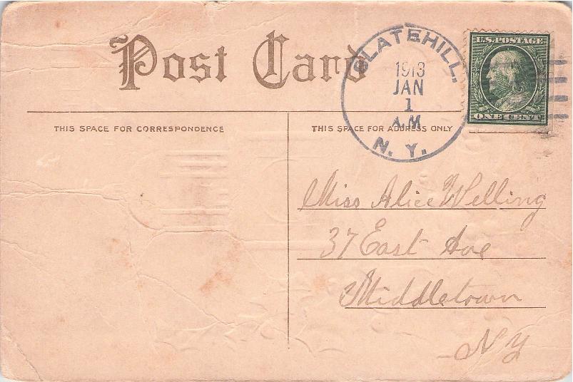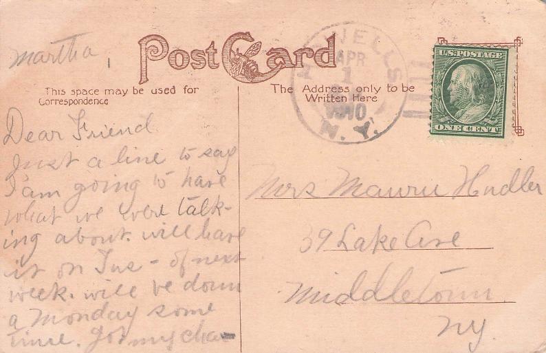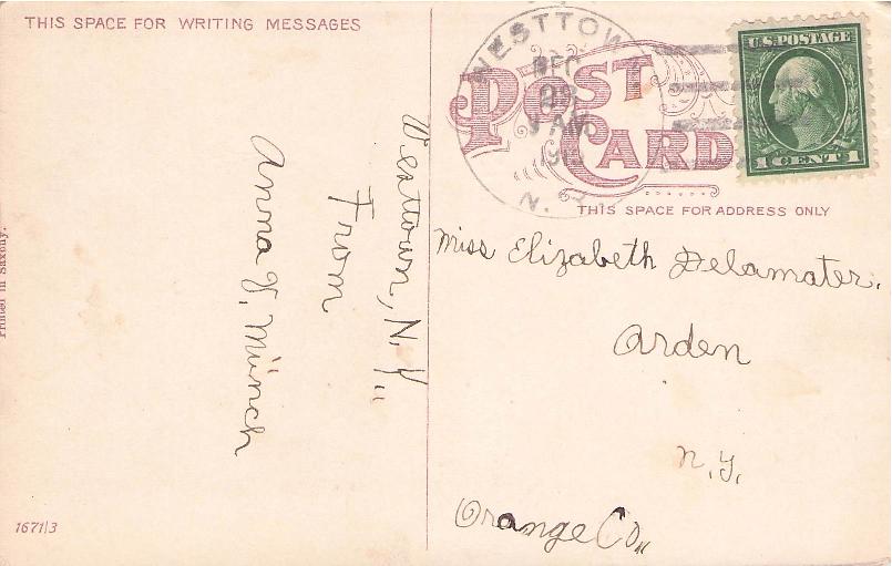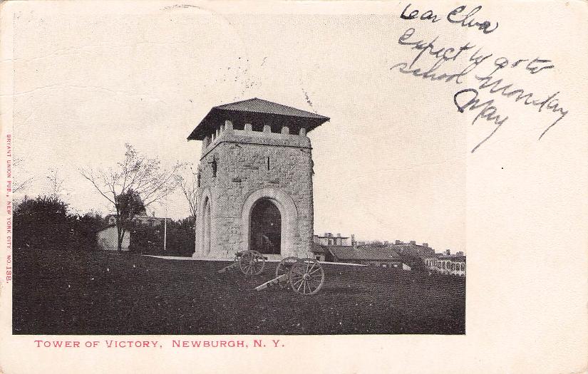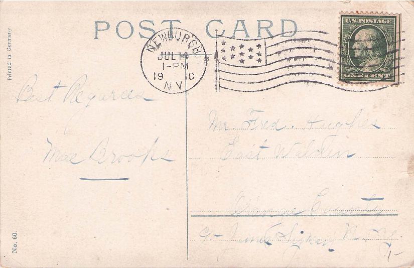 Post cards: Palatine Hotel [B&W, 1948]; Washington’s Headquarters [1912]; Revolutionary War monument [chrome]; New Windsor Cantonment [chrome, nicked & creased]; Chapel, Stewart AFB (chrome); “Tower of Victory” [B&W, 1904], stamp torn off but nice Brooklyn Circuit RPO mark