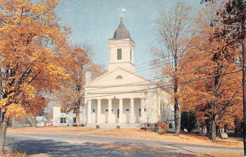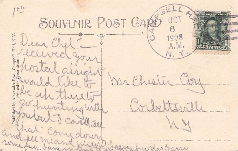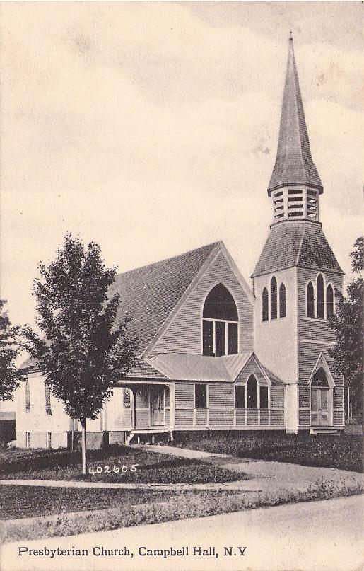 Campbell Hall 1908 4-bar on B&W post card with view of Campbell Hall Presbyterian Church